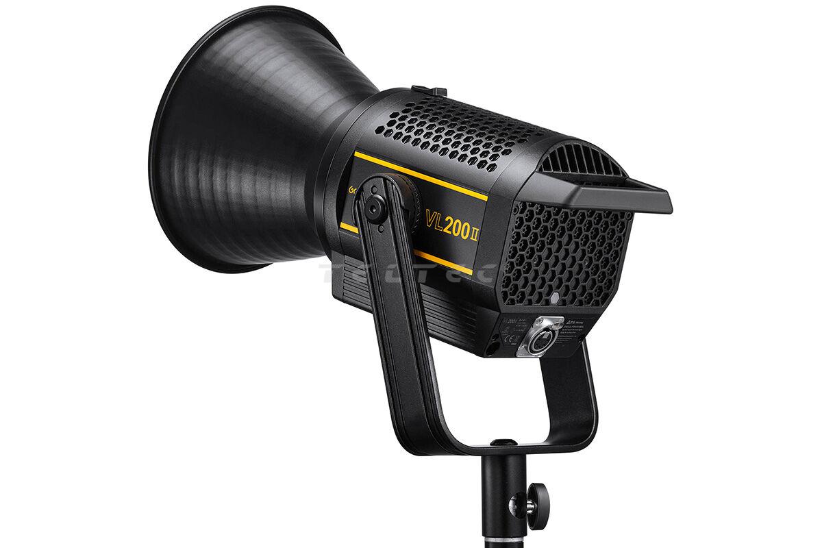 Das Godox VL200W II ist eine dimmbare 215 W Tageslicht LED Leuchte (5.600 K). Das leichte und kompakte Design mit getrenntem Leuchtkörper und Controller macht es einfacher zu transportieren. Der Lüfter ist mit <30 dB extrem leise und sorgt trotzdem zugleich für eine konstant gute Leistung der Leuchte. Betrieben wird sie entweder über das Netzteil oder kabellos über V-Mount-Akku. Mit CRI- und TLCI-Durchschnittswerten von mindestens 96 sorgt diese Leuchte für natürliche Farbtreue in jeder Aufnahmesituation. Die U-förmige Leuchthalterung erlaubt eine 360°-Drehung des Leuchtkörpers, hängend immer noch 340°. Durch den Bowens-Mount ergeben sich zudem noch viele verschiedene Setup-Möglichkeiten mit z.B. Lichtformern und Softboxen.