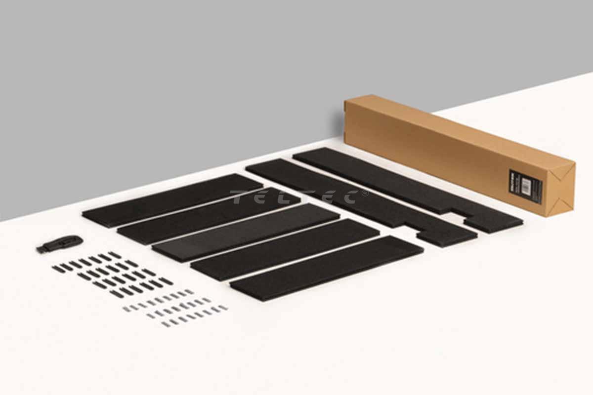 Das GUTEK AS-DV-T300 Inneneinteilungs-Set für Schutzkoffer T-300 ist für die gepolsterte Einteilung des Kofferinneren. Sie passen perfekt zu den bereits im Koffer angebrachten Schaumstoffpolstern in Boden und Deckel. Insgesamt sind 7 Trennwände aus Moosgummi enthalten, wovon 2 entlang der Kofferwände zum Einsatz kommen, während mit den anderen 5 der Innenraum nach Belieben auf- bzw. eingeteilt werden kann. Um möglichst viele Möglichkeiten zu haben, was die individuelle Einteilung angeht, liegt dem Set noch spezielles Schneidewerkzeug bei. Außerdem sind auch Metallklammern gegen das Verrutschen der Trennwände und optionale Zuglaschen für diese dabei.