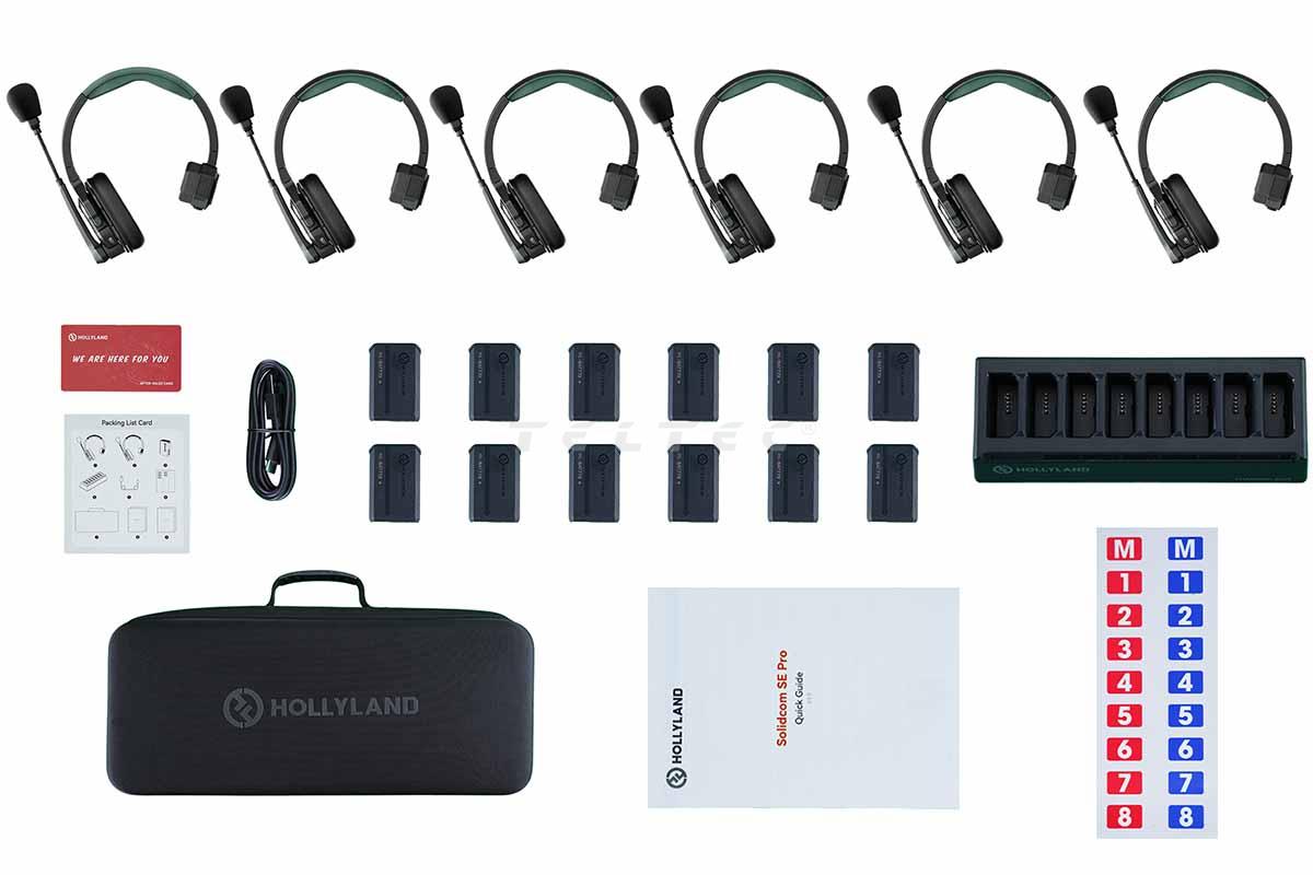 Das Hollyland Solidcom SE Pro 6S ist ein 6-Personen Headset-Intercom-Bundle mit Geräuschunterdrückung. Das Hollyland Solidcom SE Pro 6S ist ein 6-Personen Headset-Intercom-Bundle mit Geräuschunterdrückung. Mit einer Übertragungsreichweite von bis zu 400 m eignen sich die Headsets ideal für den Einsatz z.B. an Filmsets oder in großen Studios, wo sie bis zu 10 Stunden durchhalten. Die Dual-Mikrofon-Geräuschunterdrückung sorgt dabei für klare Stimmenübertragung. Die Headsets sind untereinander schon werkseitig gekoppelt und daher sofort einsatzbereit - dank wasserabweisender Eigenschaft auch bei leichtem Regen. Über den USB-C-Anschluss können die Akkus in weniger als 3 Stunden wieder vollständig aufgeladen werden. Im Paket sind eine 8er-Ladestation sowie 2 Akkus pro Headset dabei. Für Updates über Computer liegt ein USB-A-auf-USB-C-Kabel bei. Darüber hinaus sind auch Zahlensticker dabei, um die Headsets zur besseren Zuteilung zu nummerieren.