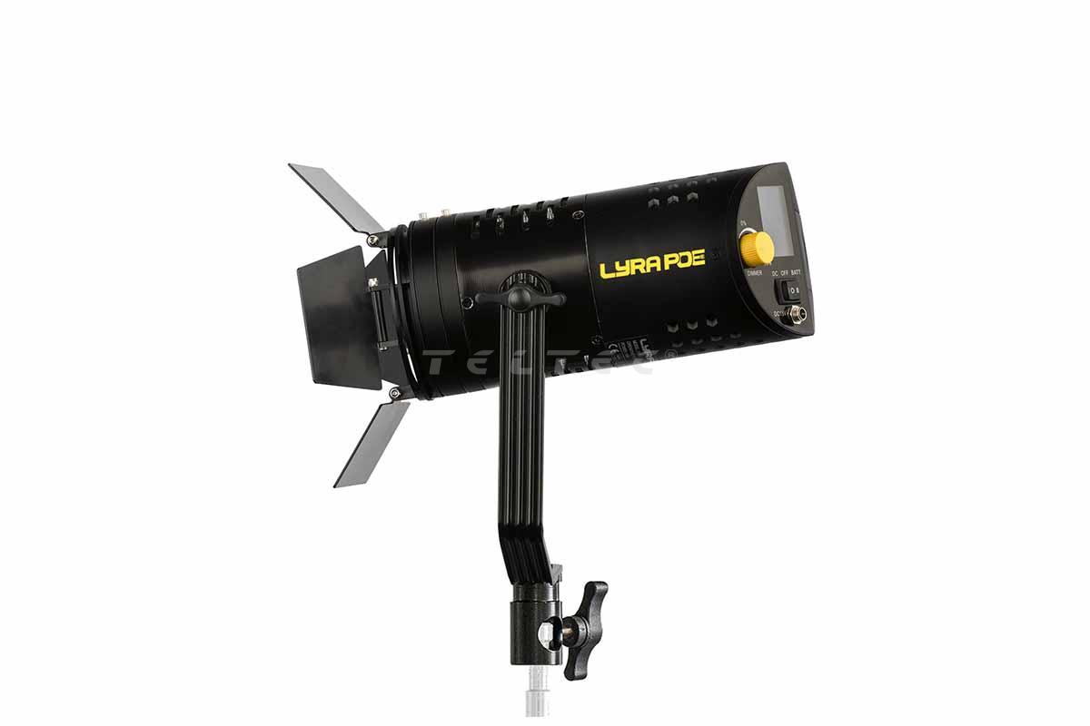 Die Ikan Lyra LBF60-POE ist eine Bi-Color Fresnel Studio Leuchte mit Stromversorgung über POE++ für Studio- oder Bühneneinsätze. Der Abstrahlwinkel des Stufenlinsenscheinwerfers lässt sich von 60° durch das Entfernen der Vorsatzlinse auf 30° reduzieren. Die Farbtemperatur der Leuchte ist zwischen 2.700 K und 5.600 K variierbar und die Helligkeit lässt sich von 100% bis 1% stufenlos dimmen. Der mitgelieferte Haltebügel hat eine kombinierte Aufnahme für einen 5/8″ (16 mm) Baby Pin oder einen 1 1/8″ (28 mm) Junior Pin.