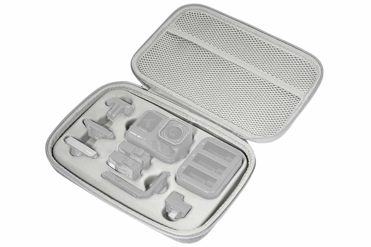 Das Insta360 Ace Pro 2 Carry Case ist ein Transportetui, das Platz für eine Actionkamera der Insta360 Ace Serie, sowie für zwei Akkus, einem Schnelllade-Hub, Mikrofonadapter und weiterem Zubehör bietet.
