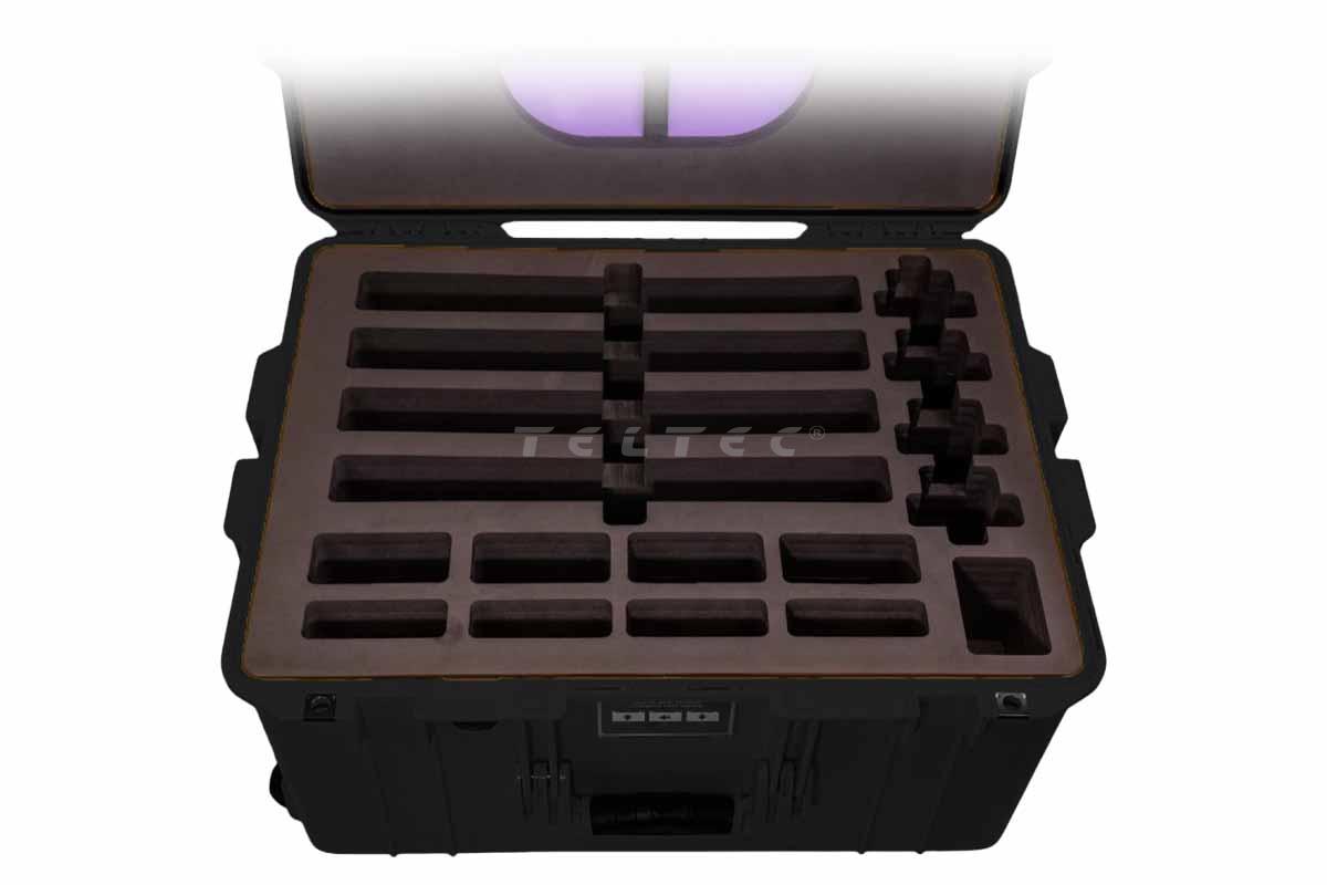 Der iodyne Hartschalenkoffer für 4x Pro Data and Accessories - Schwarz ist ein Pelicam Air Koffer und bietet Platz für bis zu 4x Pro Datas, Netzteilen, Ständern und bis zu acht Thunderbolt-Kabeln. Das Case beinhaltet integrierte Rollen und einen ausziehbaren Griff.