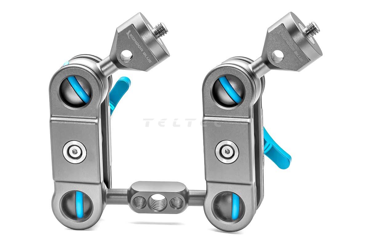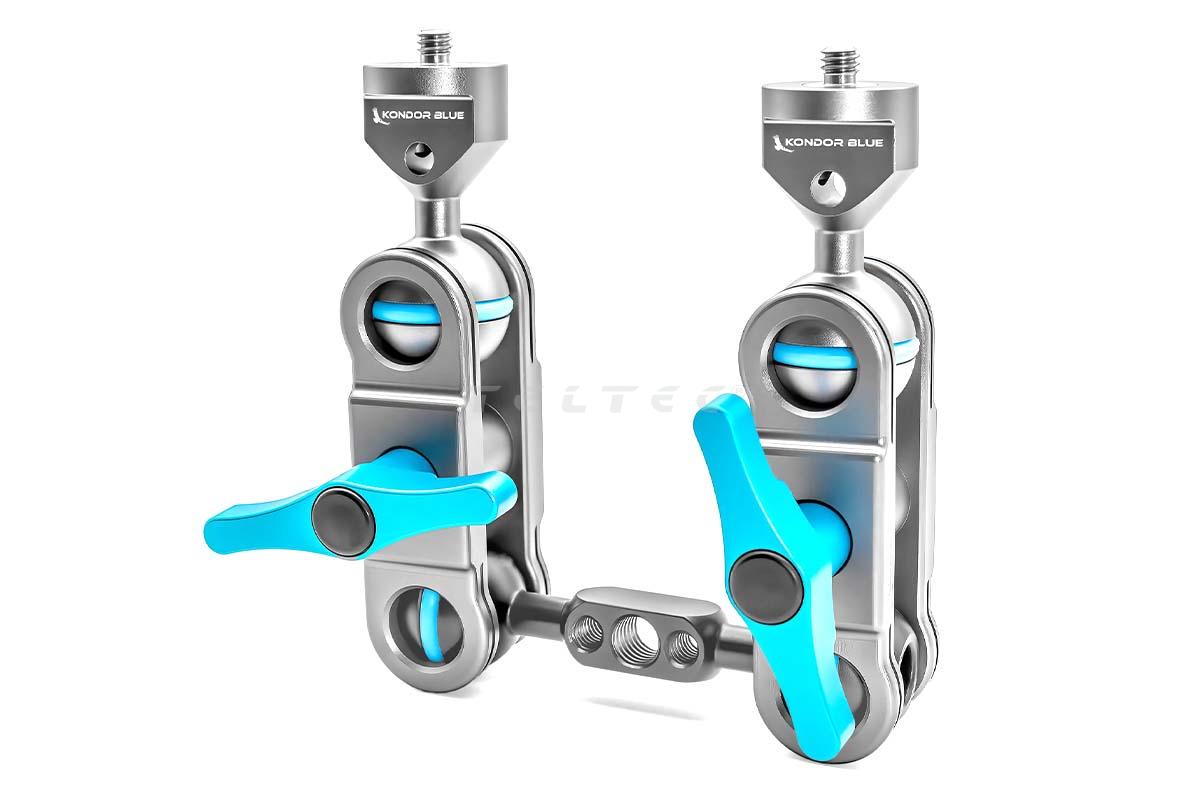 Der Kondor Blue Cine Magic Arm Pro bietet maximale Vielseitigkeit und zahlreiche Montagemöglichkeiten für das Kamera-Rig. Der Arm verfügt an beiden Enden über eine 1/4"-20 Schraube und eine Kugelkopf-Verlängerungsstange, die es ermöglicht, Zubehörteile in nahezu jedem gewünschten Winkel anzubringen. Dieser reibungsgebundene Gelenkarm, auch bekannt als Israeli Arm, ist besonders beliebt für die Befestigung von LCD-Monitoren, LED-Leuchten, elektronischen Suchern (EVF), Mikrofonen, Aufnahmegeräten, Blitzgeräten, drahtlosen Sendern, GoPro-Kameras und vielem mehr. Um die Montage von Zubehör zu erleichtern, sind beide Enden des Arms mit einer 1/4"-20 Schraube und zwei Rändelrädern ausgestattet. Bei Bedarf können die Kugelenden gegen separat erhältliche Kugelköpfe mit 3/8"-16 Schrauben und ARRI-Passstiften ausgetauscht werden.