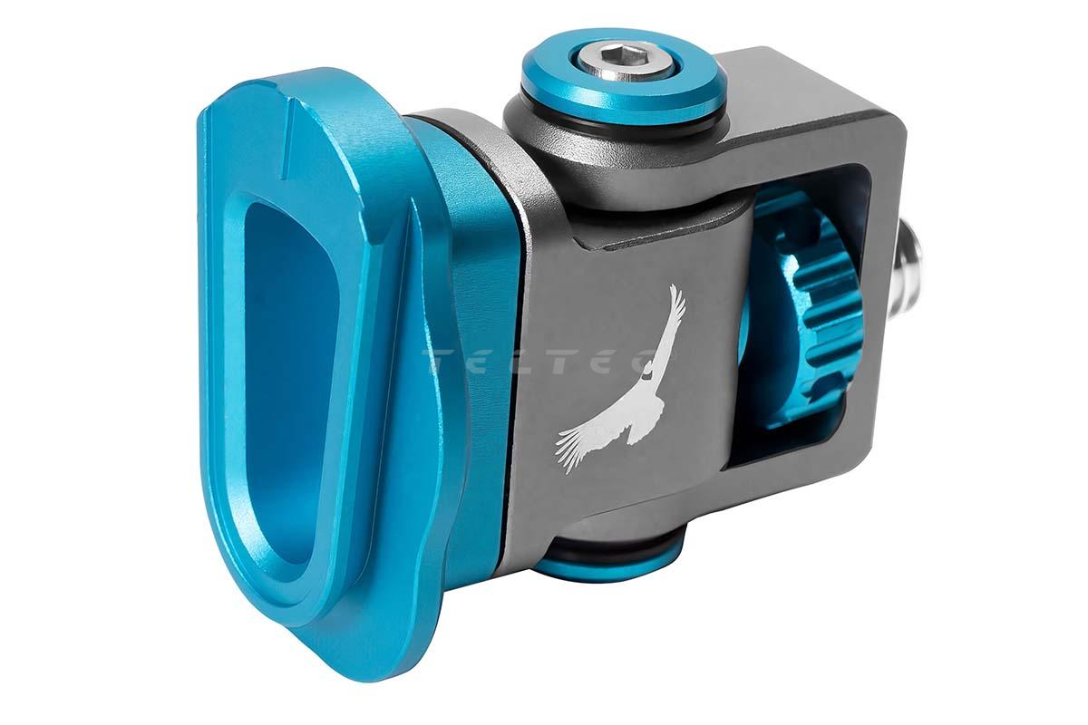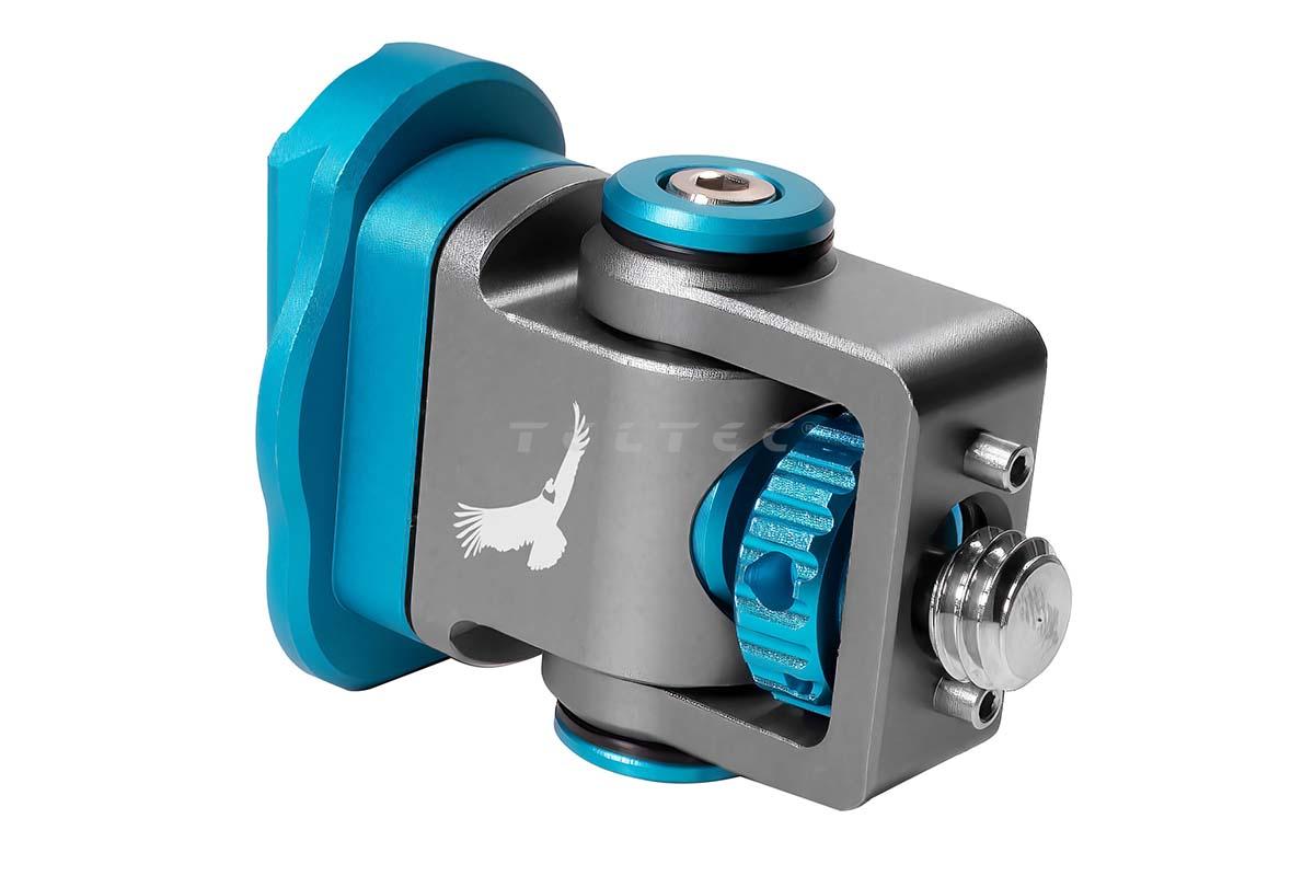 Die Kondor Blue Pro Monitorhalterung mit integriertem Mini-Schnellspanner (Neigen/Schwenken) ist eine Monitorhalterung, die speziell entwickelt wurde, um einen Monitor sicher an einem Kamerakäfig oder einem anderen Montagesystem mit einer Arri 3/8"-Halterung zu befestigen. Sie unterstützt Monitore mit einer Größe von 5" und 7" und einem Gewicht von bis zu 1,2 kg. Die Halterung bietet eine beeindruckende Flexibilität, da sie um 360° gedreht und um 170° geneigt werden kann, dank der Free-Stop-Funktion. An den Rändelschrauben der Halterung befinden sich Sechskantlöcher, um die Verwendung mit einem Sechskantschlüssel zu erleichtern. Für eine einfache Montage verfügt die Halterung über eine männliche Schnellwechselplatte, die zusammen mit den Mini-Schnellwechselplatten geliefert wird. Dadurch kann der Monitor schnell und einfach befestigt oder abgenommen werden. Um ein Verdrehen der Halterung zu verhindern, sind an der Unterseite abnehmbare Arri-Fixierungsstifte angebracht. Dadurch bleibt der Monitor sicher und stabil positioniert.