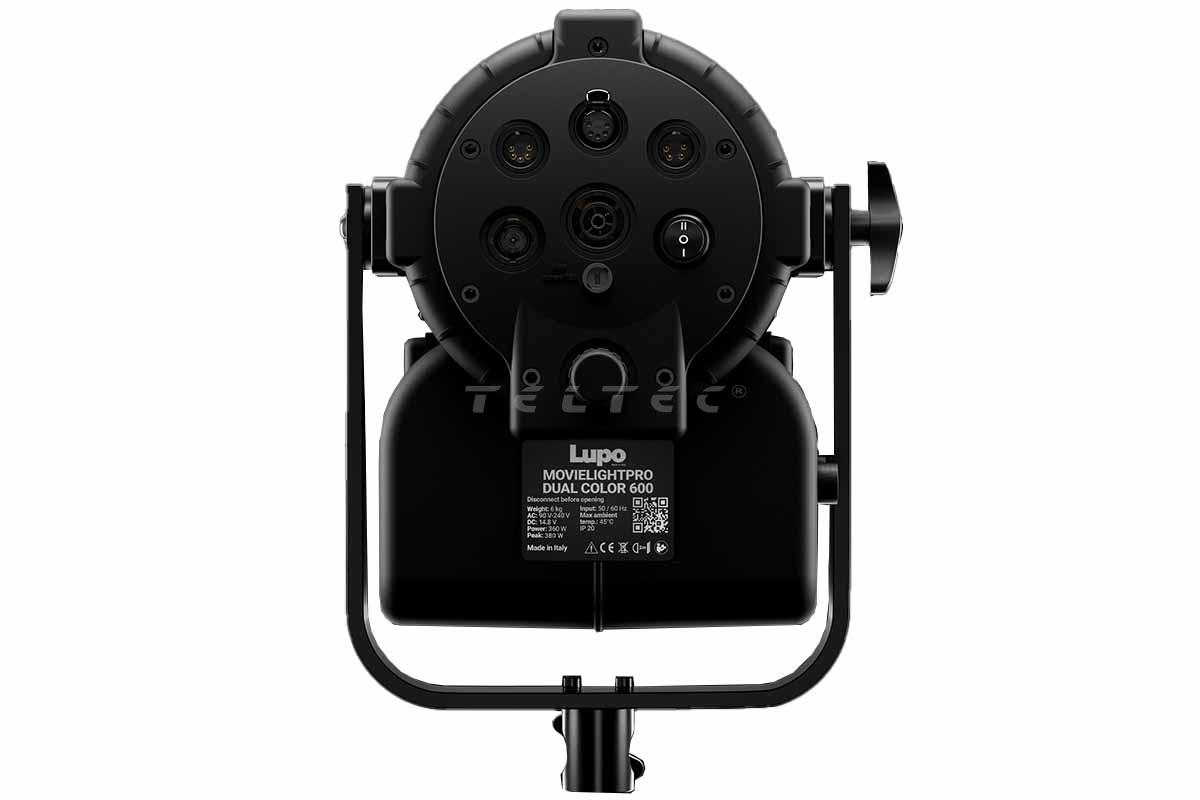 Das Lupo Light MovielightPRO Dual Color 600 ist eine dimmbare 360 W Bi-Color Leuchte mit über 26.000 Lux (@1m ohne Reflektor) und über 58.000 Lux (@1m mit Hyperreflektor), die sich durch einen geräuschlosen und flickerfreien Betrieb, auch bei High-Speed-Videodrehs, auszeichnet. Das integrierte elektronische Vorschaltgerät ist im oberen Teil des Gerätes verbaut, um den Zugang zu erleichtern. Zusätzlich ist es erforderlich das Netzkabel an einen Powercon-Stecker anzuschließen. Die Leuchte kann sowohl im Netz- als auch im Akkubetrieb arbeiten, sodass sie für jede Aufnahmesituation einsetzbar ist. Der Anschluss des Akkus erfolgt über einen 4-poligen Standard-XLR-Anschluss auf der Rückseite des Panels. Mit nur 5 kg Eigengewicht und 800 g Akkugewicht, zeichnet sich die MovielightPRO durch ein kompaktes und leichtes Design aus, das praktisch in einer Tasche transportiert werden kann. Gefertigt aus einer Trägerstruktur von Polymeren wird einer verbesserte Stoßfestigkeit, Hitzbeständigkeit und elektrische Sicherheit erreicht.