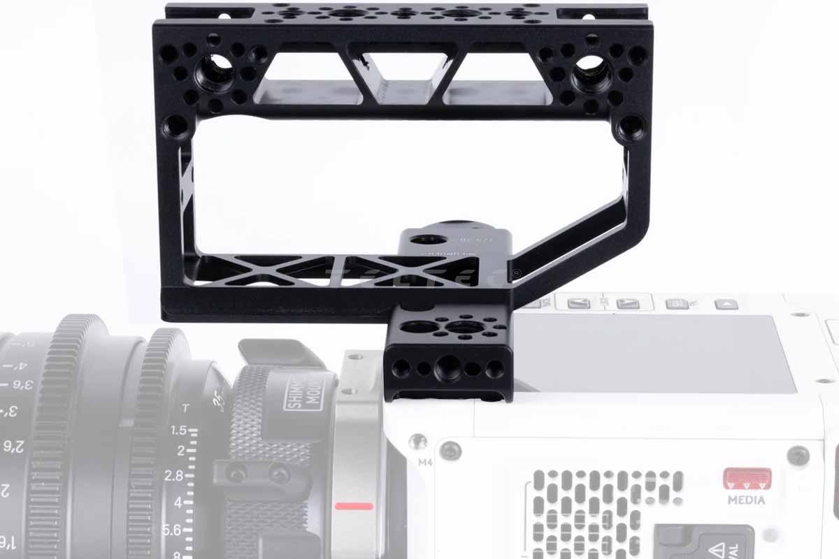 - Der ARCA Top Handle ist ein leichter, verschiebbarer Kameragriff, der am ARCA Top Mount (RED Komodo, Komodo-X, V-Raptor) befestigt wird und über 1/4-20 und 3/8-16 Befestigungslöcher mit ARRI-Passstiften in Standardabständen verfügt