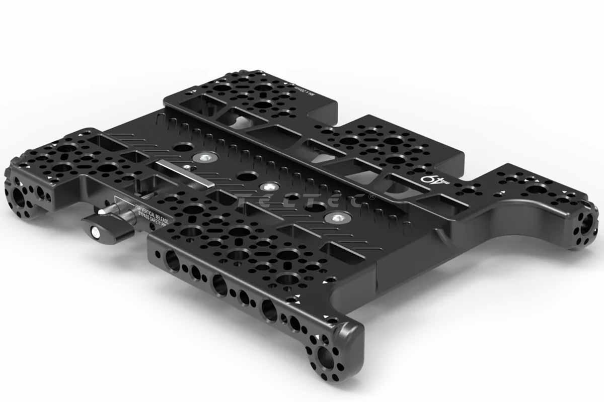 - Die mittlere ARCA-Schwalbenschwanzklemme ermöglicht die Befestigung des Rainbow Handle Kit, des ARCA Top Handle, der ARCA Top Plate und der Gimbal Adapter Plates (Freefly Mōvi Pro und DJI Ronin 2) für einen schnellen Wechsel zwischen Handheld- und Studio-Modus