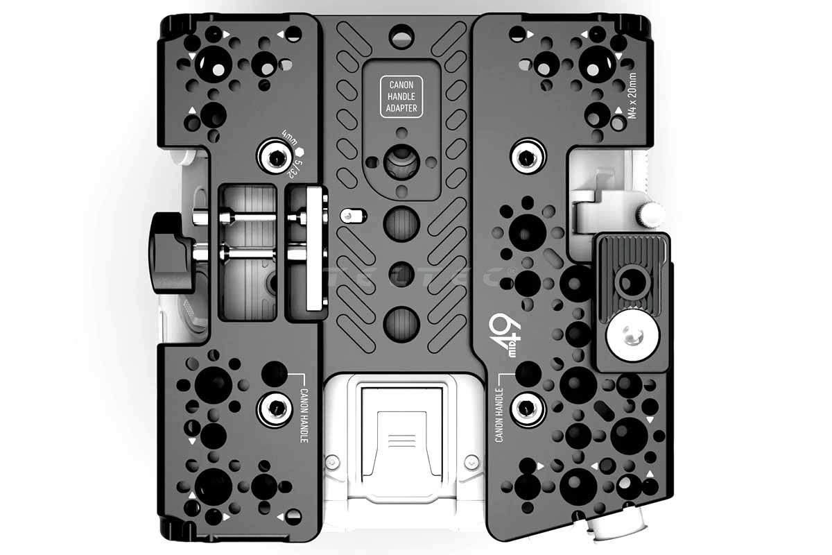 - Wenn der Adapter für den Canon Griff nicht verwendet wird, kann er auf der Top Plate positioniert werden, um Befestigungspunkte für die mitgelieferte Canon Mikrofonhalterung zu schaffen