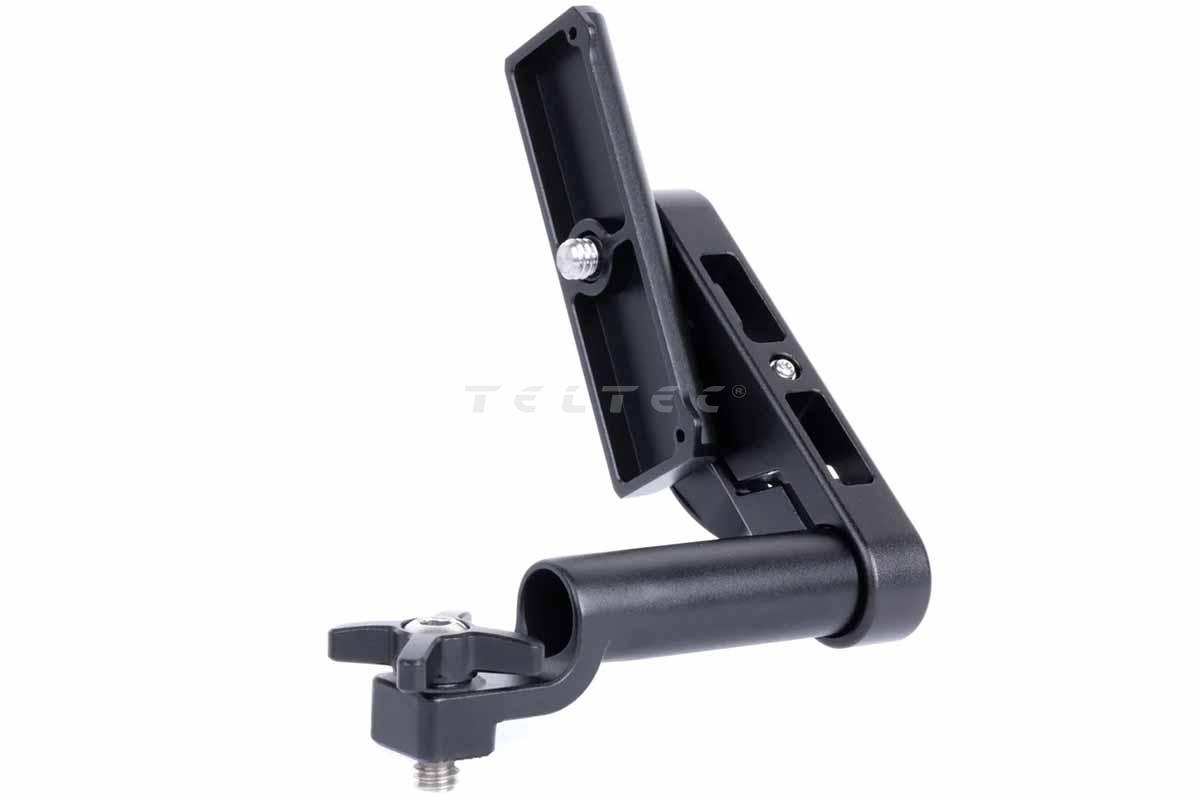 - An der Seite des horizontalen 15-mm-Rod befinden sich eine 1/4-20-Klemme und Fixierungslaschen, mit denen die Original-Mikrofonhalterung von Canon (Canon Teil DG3-7370-000) mit dem mitgelieferten 1/4-20-Rändelknopf befestigt werden kann