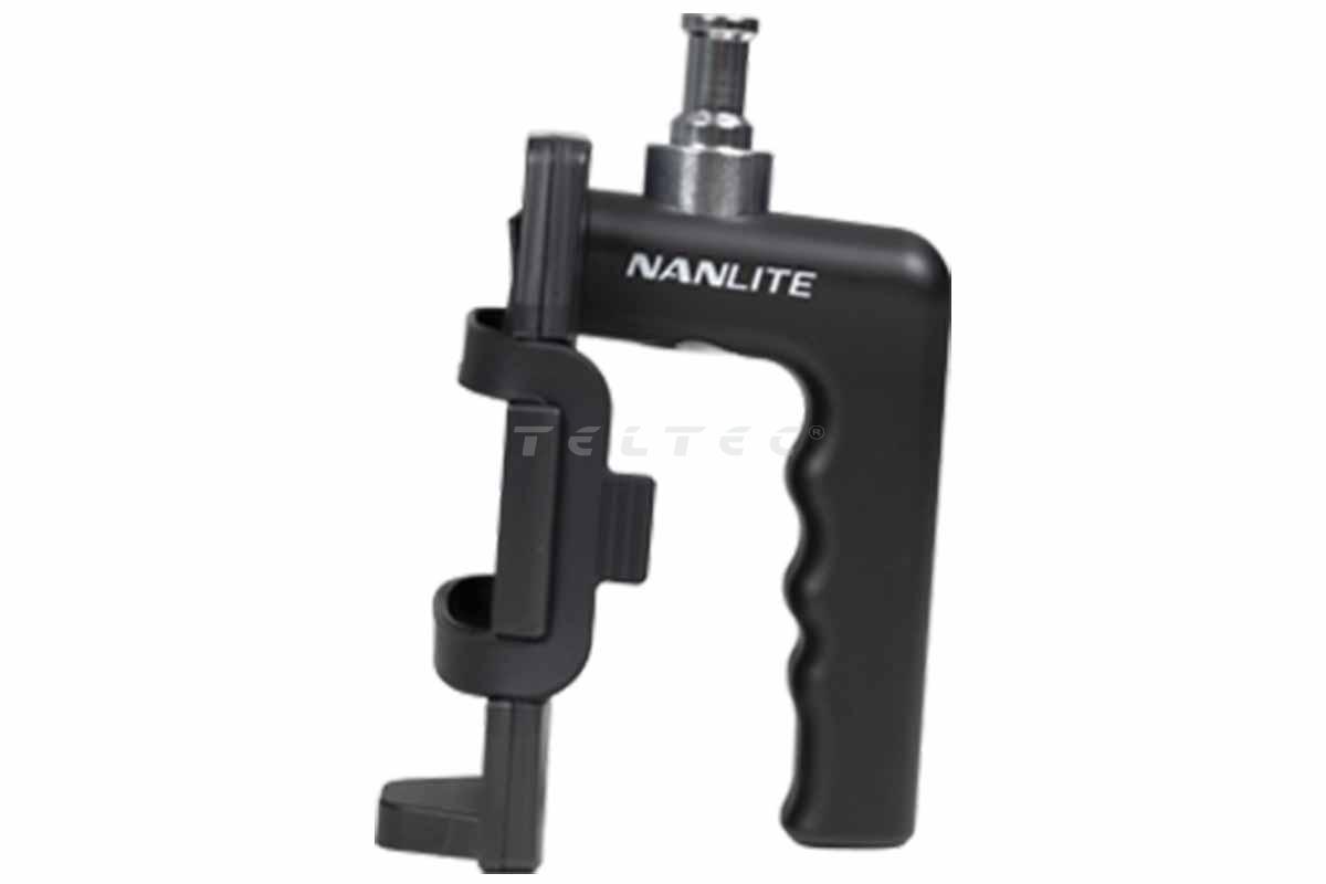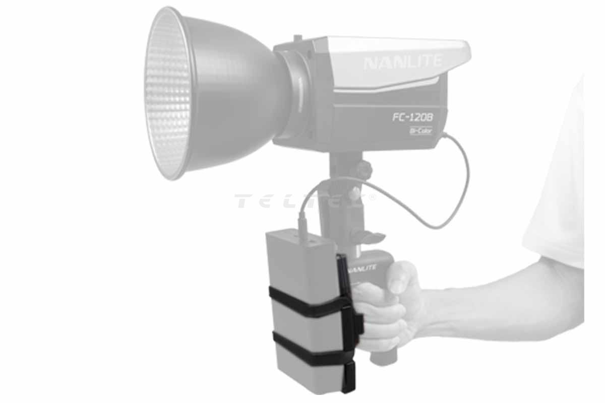 Der Nanlite BT-BG-PB ist ein Powerbank-Griff, der zum Halten einer Leuchte* und einer Powerbank dient. Der Powerbank-Griff verfügt über einen strapazierfähigen, rutschfesten Silikonriemen, mit dem die Powerbank schnell am Halter befestigt werden kann, indem der Riemen um die Lasche gewickelt wird. An der Oberseite befindet sich ein 5/8"-Baby-Pin zum Anschluss an die Leuchte. Der Griff kann in der Hand gehalten oder mittels 5/8"-Empfänger an der Unterseite an einem Lichtstativ befestigt werden.