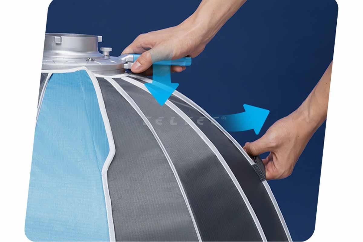 Die Nanlite SB-RP90 Parabol-Softbox Rapid 90 ist eine Softbox für LED-Leuchten/Scheinwerfer sowie Blitzköpfe mit Bowens-Bajonettanschluss, z. B. für Forza 300(B) II / 500(B) II / 720(B), FS-150(B) / -200(B) / -300(B) / -300C und FC-300B / -500B / -500C. Sie ist nicht geeignet für Leuchten/Scheinwerfer mit heißem Licht (wie z. B. Halogen- oder Glühlampe).