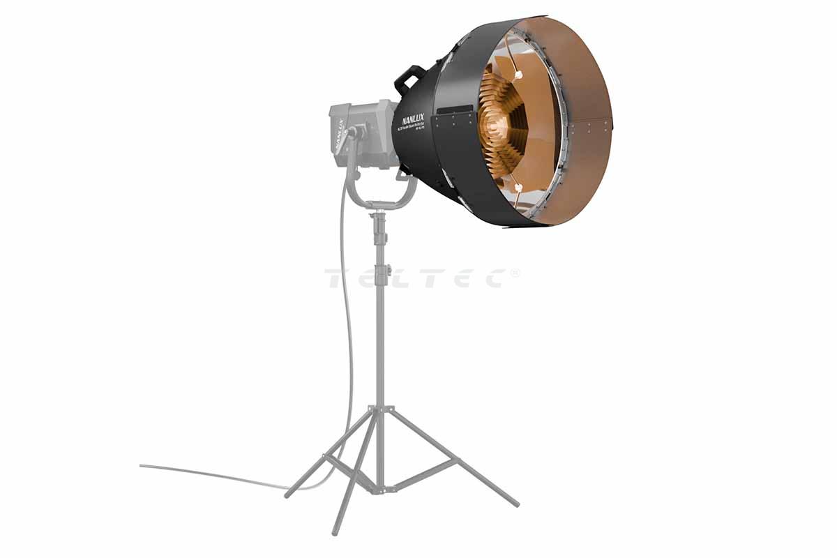Das Nanlux NL70 (RF-NL-PB) ist ein Parallelstrahl-Reflektor für die Evoke-Serie, der zur Erzeugung spezieller Strahleneffekte, wie der Simulation von Sonnenlicht, dient. Der Reflektor erzeugt einen 6°-Parallelstrahl und ist mit den Evoke-Leuchten mit NL-Mount, wie z.B. Evoke 900C, 1200, 1200B, 2400B, kompatibel. Wird der NL70 in Kombination mit der Evoke 2400B verwendet, so bewirkt er die 21-fache Beleuchtungsstärke. Darüber hinaus gibt es eine einfach zu fixierende Haube, die in 4 Einzelblätter zerlegbar ist und mit einem Klettverschluss befestigt wird.