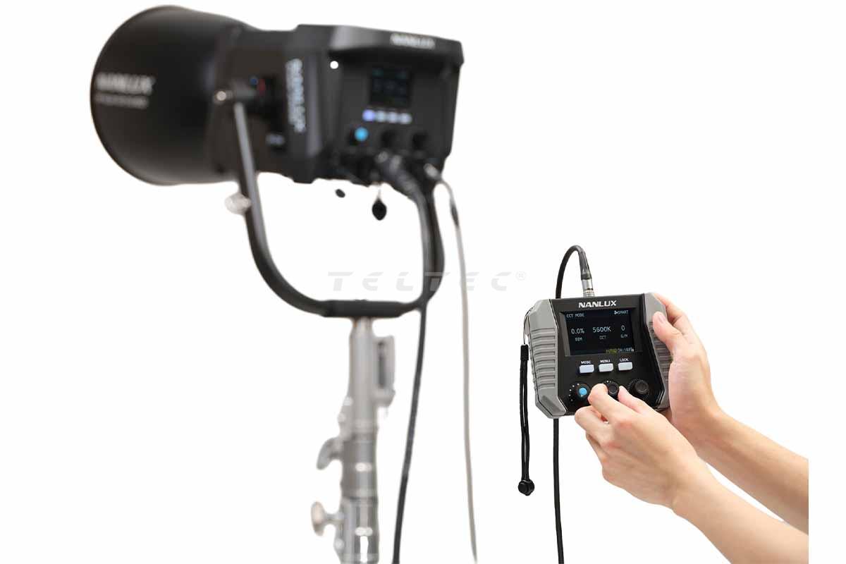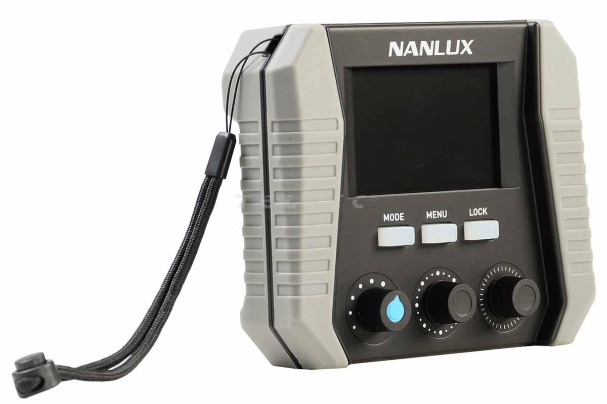 Die NANLUX WC-LM6P-C1 Kabelfernbedienung für Evoke-/Dyno-Leuchten ist eine kabelgebundene Bedieneinheit mit Display. Sie verfügt über einen 6-poligen Eingang für das mitgelieferte Kabel und kann damit verbundene Leuchten fernsteuern. Bis zu 8 m vom Leuchtkopf entfernt. Dabei ist das Design der Fernbedienung an die Bedienoberfläche der Leuchten angelehnt, um direkt vertraut zu wirken. Insgesamt je 3 strategisch platzierte Drehregler und Tasten bieten hier viele Steuerungsmöglichkeiten wie Helligkeitseinstellung mit einer 0,1-%-Genauigkeit oder die Steuerung der Grün-/Magenta-Werte. Per Tastendruck kann zwischen dem aktuellen und dem Nullzustand hin- und hergewechselt werden, während eine andere Taste für die CCT-Einstellungen verantwortlich ist. Die intuitive Bedienung und der 3,2"-Bildschirm gewährleisten einen effizienten Workflow. Mit dabei ist neben dem Kabel auch eine Transporttasche.