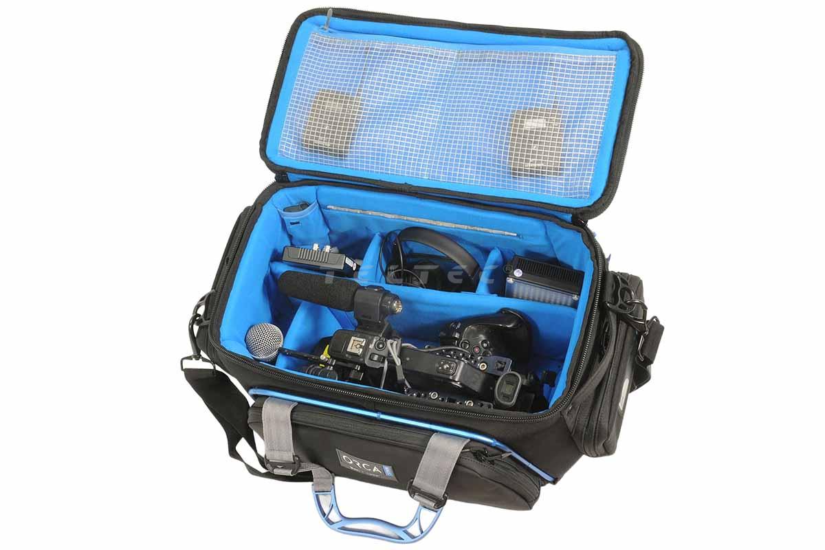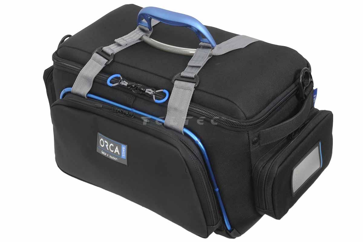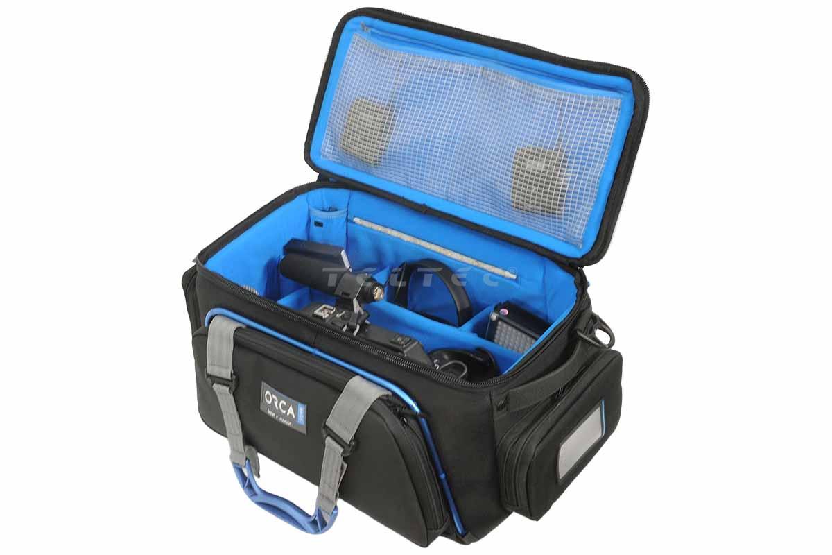 Die ORCA OR-12 ist eine Schulter-Videotasche für professionelle Camcorder und Cine-Kameras bis ca. 52 cm Länge. Sie kombiniert einen äußeren Aluminiumrahmen, einen inneren Wabenrahmen sowie Schaum-/EVA-Polsterung für maximalen Schutz. Die weite Top-Öffnung mit hellblauem Innenfutter erleichtert den Überblick und Zugriff am Set. Ein flexibles Trennwandsystem erlaubt die passgenaue Innenaufteilung für die Kamera und das Zubehör. Zudem kann die Tasche am ORCA-Trolleysystem (OR-70) befestigt werden.
