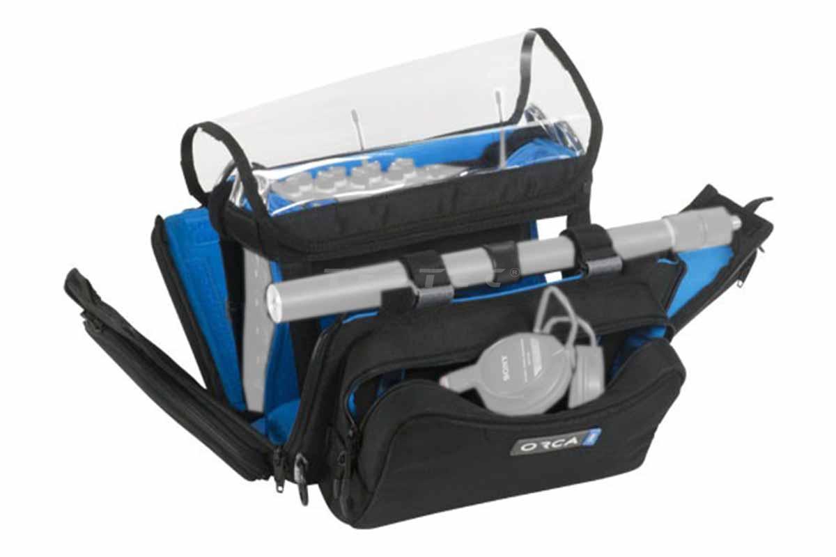 Die Orca OR-280 Sound Bag ist eine kompakte und robuste Audiotasche für den mobilen Einsatz mit Field-Recordern und Audio-Mixern. Sie wurde speziell für Geräte der MixPre-Serie sowie vergleichbar große Mixer entwickelt und bietet eine flexible Lösung für professionelle Tonaufnahmen im Außeneinsatz. Im Inneren sorgt ein stabiler Wabenrahmen (Honeycomb Frame) für einen zuverlässigen Schutz des Equipments und bildet eine Art Schutzkäfig rund um den Recorder. Ergänzt wird dies durch verstellbare Innenpolster (Sponge Lifts) und Trennelemente, die eine individuelle Anpassung an verschiedene Setups ermöglichen. Für eine optimale Übersicht verfügt die Tasche über ein hellblaues Innenfutter sowie eine transparente TPU-Abdeckung, die den Blick auf das Equipment erlaubt und gleichzeitig Schutz bietet. Der Zugriff auf das Setup ist von allen Seiten möglich, wodurch Bedienung, Verkabelung und Akkuwechsel schnell und effizient durchgeführt werden können. Zusätzlichen Stauraum bieten eine große Fronttasche sowie weitere Fächer für Zubehör wie Kabel, Funkstrecken oder Akkus. Außenliegende Klettschlaufen ermöglichen die Befestigung von Kabeln oder einer Tonangel. Die OR-280 kann über zwei Tragegriffe oder einen gepolsterten Schultergurt transportiert werden und ist zudem mit dem optionalen Orca Harness kompatibel, um das Gewicht ergonomisch zu verteilen.