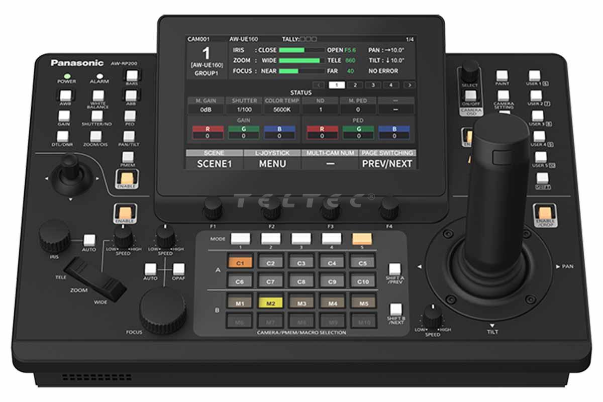 Der Panasonic AW-RP200GJ ist ein hochprofessioneller Remote Camera Controller für PTZ- und Studio-Kameras, der maximale Flexibilität und intuitive Bedienung für Live-Produktionen bietet. Mit seinem Dual-Joystick-System – einem Joystick für Schwenken/Neigen und einem multifunktionalen Stick für Iris, Zoom und Fokus – ist eine präzise und komfortable Steuerung möglich. Dank der neuen Macro-Funktion lassen sich komplexe Kamerabewegungen speichern und abrufen. Über IP ist die Steuerung von bis zu 200 Kameras möglich, ergänzend dazu können über RS-422 seriell bis zu 3 Kameras verbunden werden. Das integrierte 7-Zoll Touch GUI-Display (WVGA 800×480) bietet klare Übersicht über Status und Menüs. Tally-Anzeige, frei belegbare Funktionstasten sowie ein robustes Gehäuse runden das professionelle Gesamtpaket ab.