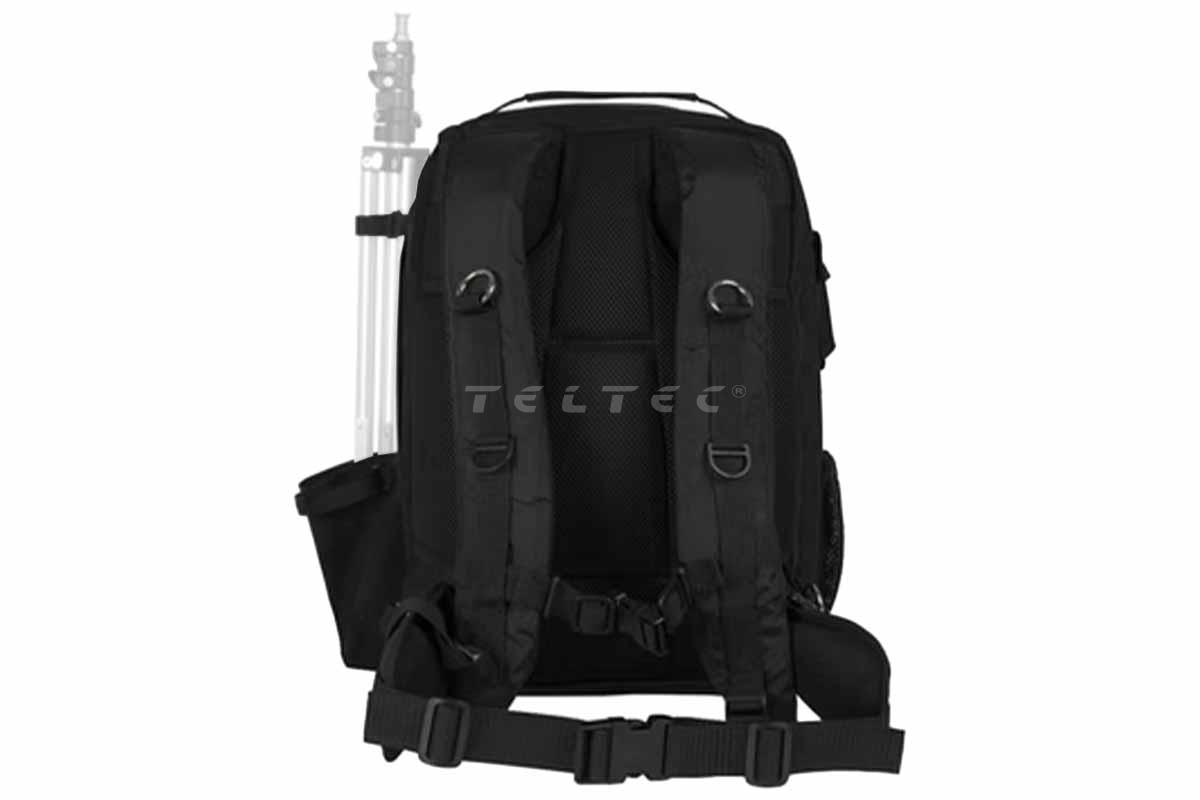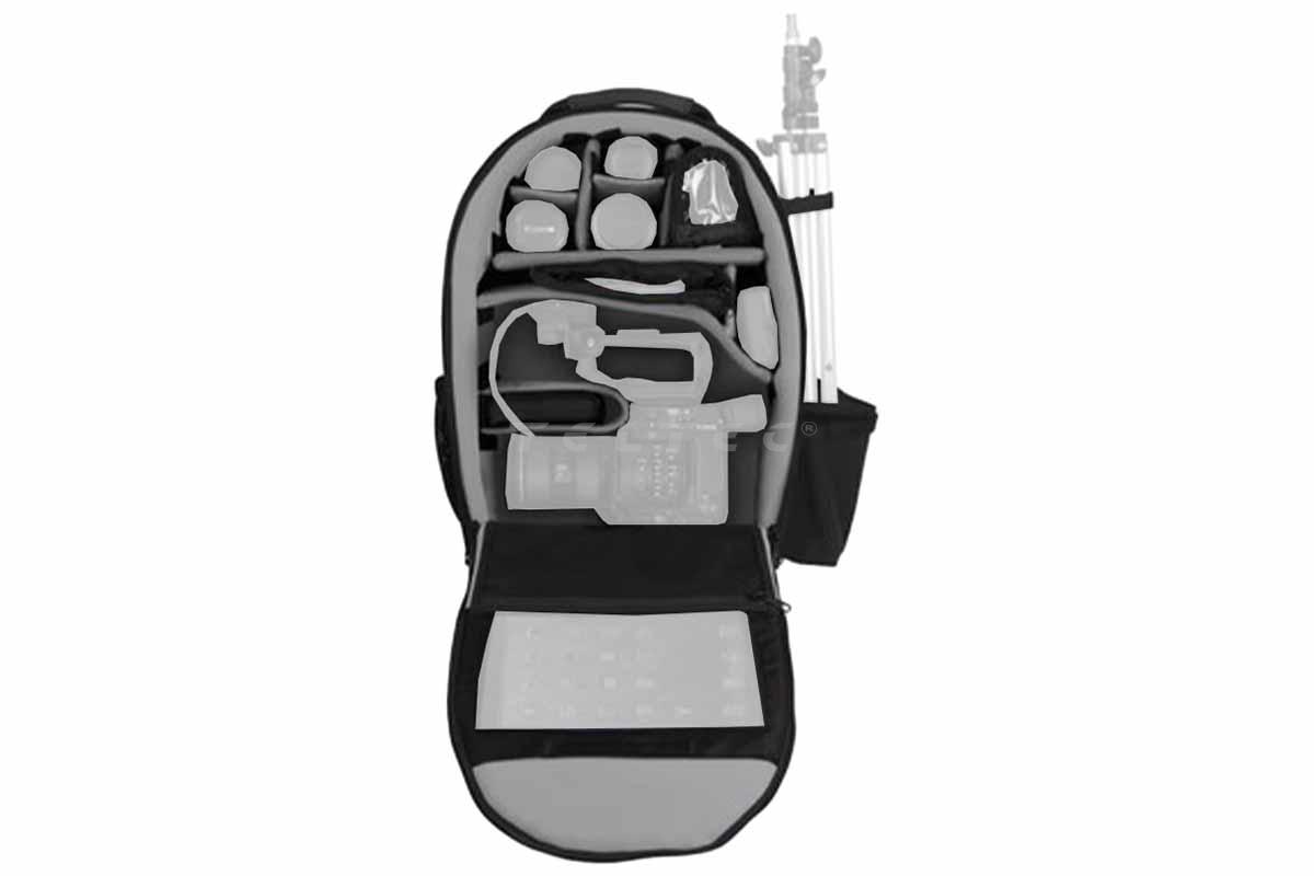 Der Porta Brace BK-C200 Kamera-Rucksack ist speziell für die Canon EOS C300 Mark III Kamera mit Zubehör konzipiert. Er bietet eine Multifunktions-Seitentasche für ein Stativ oder Ähnliches und ein separates, gepolstertes Laptopfach.