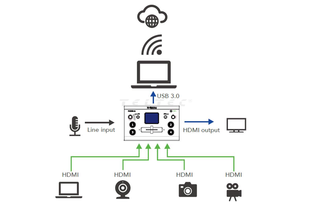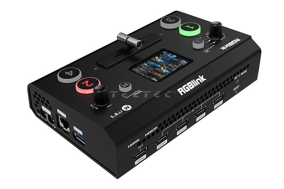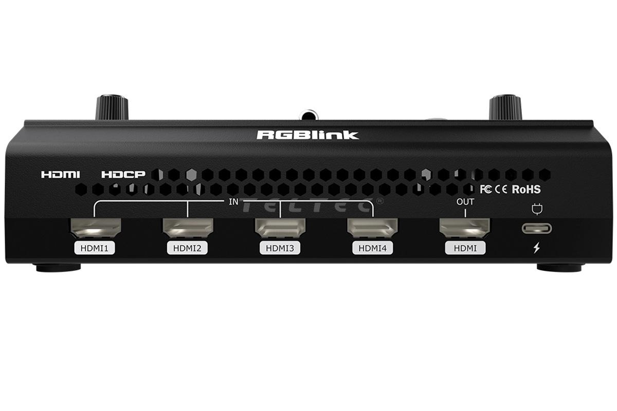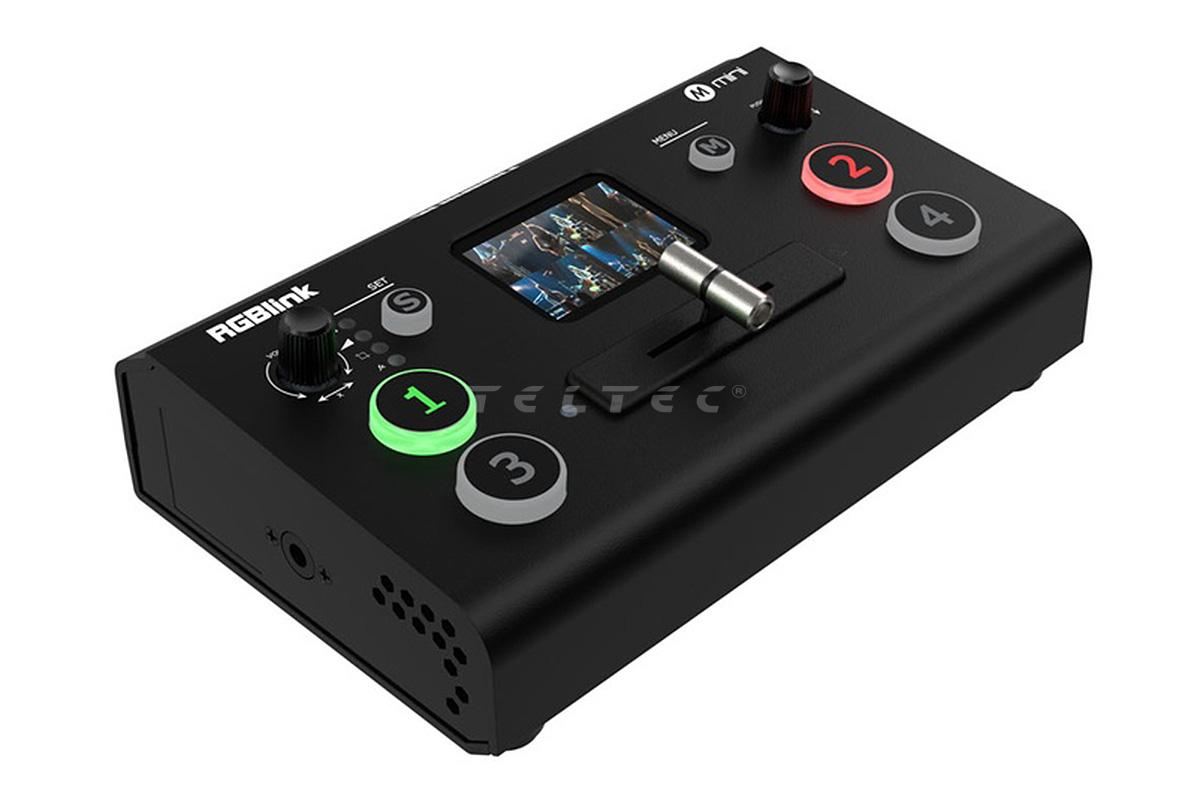 Der RGBLink Mini V2 ist ein kompakter FullHD Videomischer mit 4 HDMI-Eingängen. Der Mini V2 bietet dank der großen Tasten eine erleichterte Bedienung, die T-Bar soft für sanfte Übergänge zwischen den Videosignalen. Das verbaute 2"-LCD-Display zeigt die vier Eingangssignale inklusive der Auflösung und der Frames an. Zusätzlich verfügt der RGBLink Mini V2 über einen 3,5 mm Klinkenanschluss für LineIn-Eingangssignale und einen 3,5 mm Klinkenanschluss für Kopfhörer.
