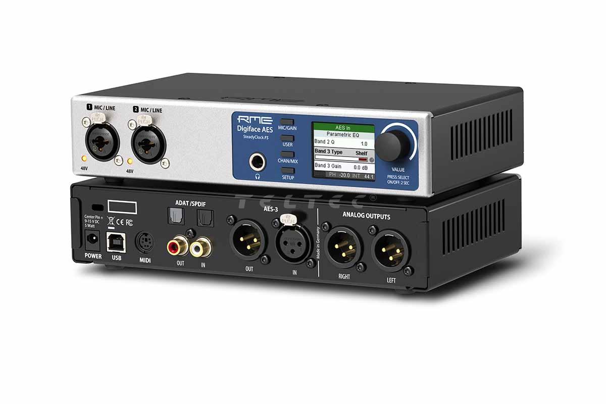Das RME Digiface AES ist ein professionelles USB-Audiointerface mit 14 Ein- und 16-Ausgängen. Darüber hinaus verfügt das Gerät über 2 analoge Mikrofon-/Line-Universaleingänge und 4 analoge Ausgänge. Das RME Digiface AES ist die ideale Lösung zur Aufnahme und Wiedergabe analoger und digitaler Quellen, da es über zahlreiche digitale Anschlussmöglichkeiten, SteadyClock FS sowie einen eingebauten parametrischen EQ verfügt. Mit dem integrierten Sample Rate Converter (SRC) lassen sich Taktprobleme lösen und an unterschiedliche Abtastraten anpassen. Der SRC kann auf einen von drei Eingängen geschaltet werden. So kann das Gerät beispielsweise AES-taktsynchronisiert von der Hauptquelle betrieben und gleichzeitig SPDIF unabhängig abgehört werden. Durch das im Lieferumfang enthaltene Breakout-Kabel wird das Angebot durch MIDI I/O vervollständigt. Das Audiointerface verfügt über volle Stand-alone Funktionalität, das sich über Drehregler an der Frontplatte steuern lässt. Mehr Flexibilität bietet zudem das TotalMix FX für grenzenloses Routing und Mixing, das so viele unabhängige Submixe erstellt, wie Ausgangskanäle zur Verfügung stehen. Über die DigiCheck Software-Toolbox ist das Testen, Messen und Analysieren digitaler Audiosignale möglich.