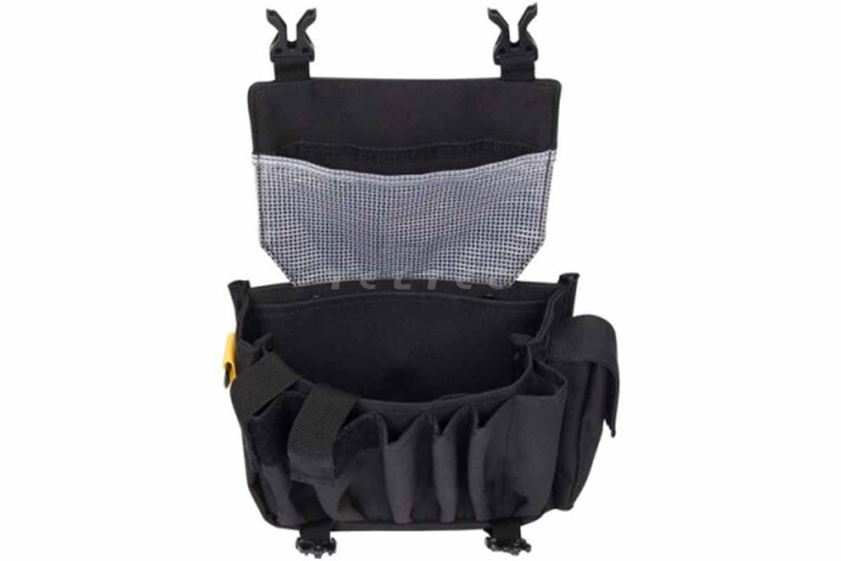 Der RoboCup AC Belt Organizer Pouch with Silent Storage Pocket ist eine Gürteltasche zum Verstauen von Tools und Accessoires. Die Hauptlasche kann durch zwei Nylonschnallen geräuscharm geschlossen werden. Die Tasche bietet Platz für Tools und Accessoires und schützt diese durch Material in Industriequalität und verstärkte Nähte. Die Gürtelschlaufe ist zusätzlich dazu noch mit 4 Metallnieten verstärkt. An der Seite hängt zudem noch ein metallener D-Ring etwa für Schlüssel und Karabinerhaken. Auf der Vorderseite befindet sich eine Klettfläche für optionale Zusätze.