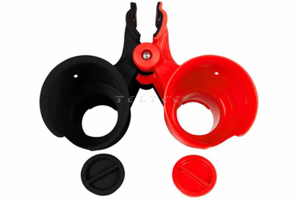 Der RoboCup Red/Black ist ein Getränkehalter mit zwei Cups, den man an diversen Geräten montieren kann. Die starken federgestützten Klemmen können problemlos an flachen und runden Kanten von bis zu 50 mm Dicke geklemmt werden. Die Cups nehmen Dosen und Flaschen mit einem Durchmesser von ca. 50 bis 75 mm auf. Ein Cup ist schwarz, der andere rot.