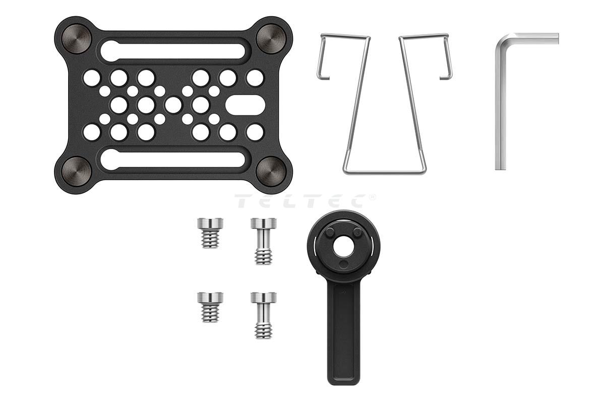 - 1x Montageset (Montageplatte, Kamera-Adapter, Gürtelclip und Schrauben)