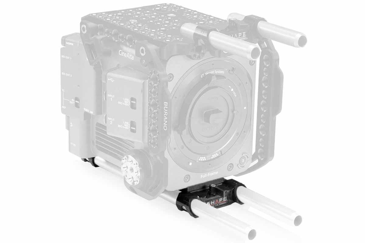 Die Shape 15mm LWS Baseplate für die Burano ist eine 15-mm-LWS-Bodenplatte mit zwei 12"-Stangen. Sie wird über zwei 3/8"-16-Schrauben direkt an der Unterseite der Kamera montiert. Darüber hinaus finden sich dort auch weitere Gewindelöcher, um die Kamera auf einem Stativ befestigen zu können. Damit die mitgelieferten Stangen fest und sicher sitzen, gibt es sowohl vorne als auch hinten Ratschenknöpfe. Damit sind die 12"-Stangen bereit, zusätzliches Zubehör oder Aufsätze aufzunehmen.