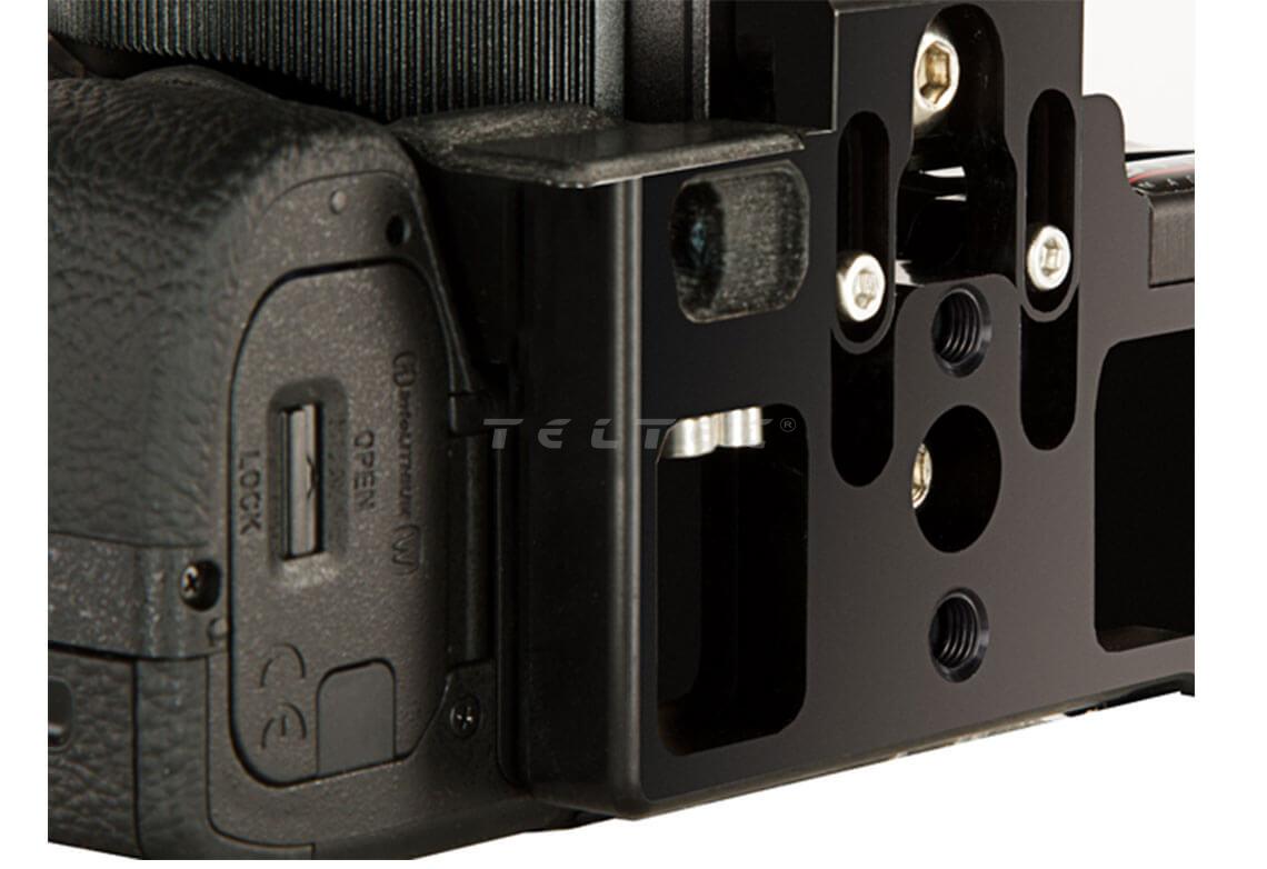 Sie sehen hier SHAPEs Cage für die Alpha 7 Serie von Sony, die A7S II, A7R II und Sony A7 II. Er ermöglicht einen einfachen Zugang zu den Knöpfen der Kamera, den seitlichen Ausgängen und zum Akku, sodass der Cage nicht von der Kamera entfernt werden muss. Das Micro-HDMI Kabel wird dabei befestigt und geschützt. Außerdem liegt der Hotshoe Anschluss frei, was es ermöglicht, weiteres Zubehör anzuschließen.