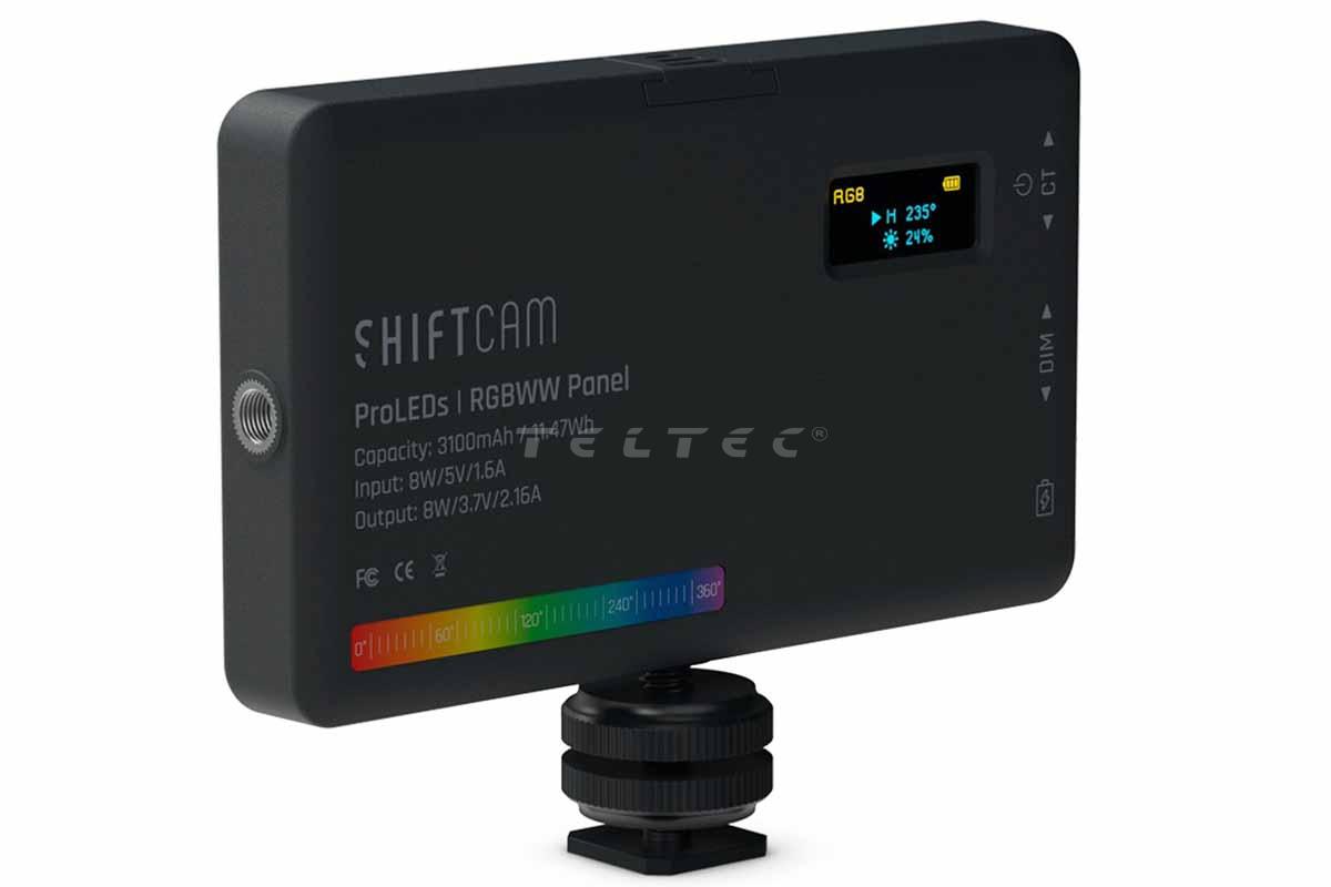 Das ShiftCam ProLED-RGBWW Panel [114575] ist ein kompaktes und tragbares LED-Panel. Es verfügt über zwei Beleuchtungsmodi, die viele Einstellmöglichkeiten mit sich bringen. Im RGB-Modus lassen sich über 360 Farbtöne frei in der Sättigung und Helligkeit verstellen, sodass immer die gerade benötigte Farbe gefunden werden kann. Der CCT-Modus dagegen stellt einen Farbtemperaturbereich von 2.500 bis 9.000 K bereit, die ebenfalls in ihrer Helligkeit einstellbar sind. Das ProLED-RGBWW Panel ist mit jedem üblichen Kaltschuh und jeder Stativhalterung kompatibel. Der integrierte Akku hält bis zu 15 Stunden und kann über das mitgelieferte USB-C-Kabel wieder aufgeladen werden.