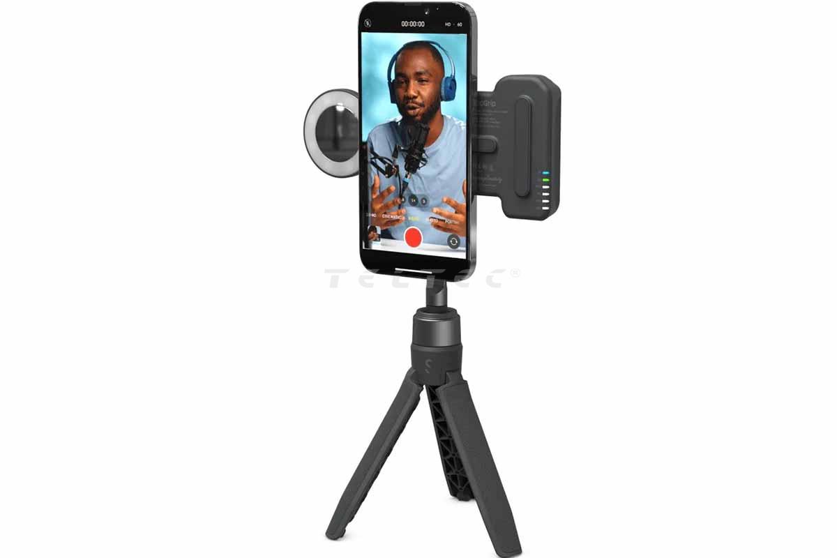 - Akkugriff, der das Smartphone mit Strom versorgt und ähnlich wie eine Kamera in der Hand liegt