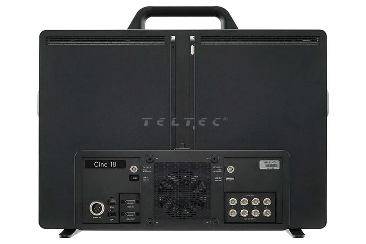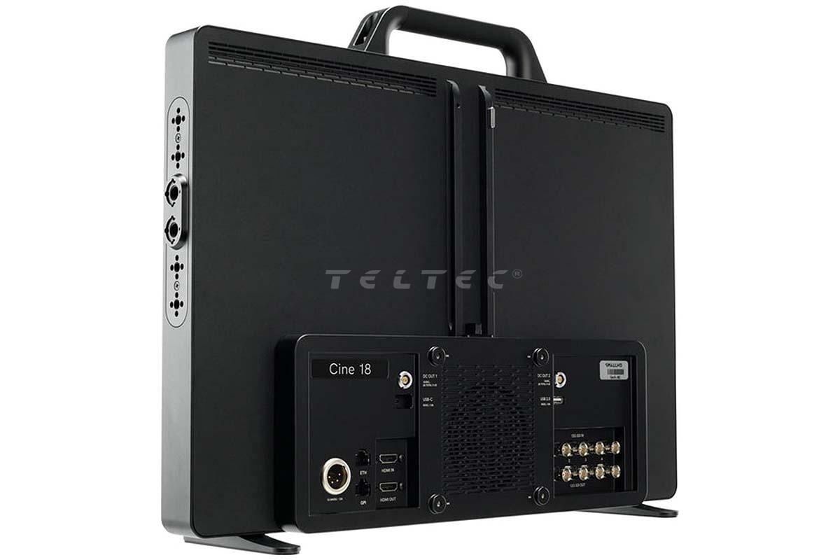 Der smallHD Cine 18 ist ein 4K-Produktionsmonitor mit einem 18,4" IPS LCD Panel. Der Cine 18 bietet mit einer Helligkeit von 1100+ nits eine brilliante Tageslichtsicht, bei einer Auflösung von 3840 x 2160 mit einer Farb-Bittiefe von 10-bit (8 + 2). Als Anschlüsse stehen je vier 12G-SDI und ein HDMI 2.0 Ein- und Ausgang, ein USB (2.4 A), ein USB (1.5 A) und ein USB-C (5 V DC / 1.5 A), ein 4-pin XLR Eingang (210 W max, 12 - 34 V DC, 18 A max), sowie zwei 2-Pin DC Buchsen (12 V DC / 2 A, steckkompatibel zu LEMO Steckverbindern) zur Verfügung. Optional kann der Monitor im Feld auch über separat erhältliche Dual Gold - oder V-Mount Akkuplatten betrieben werden. Er eignet sich speziell für Video Village, ACs, DPs, DITs oder als Monitor für Regisseure.