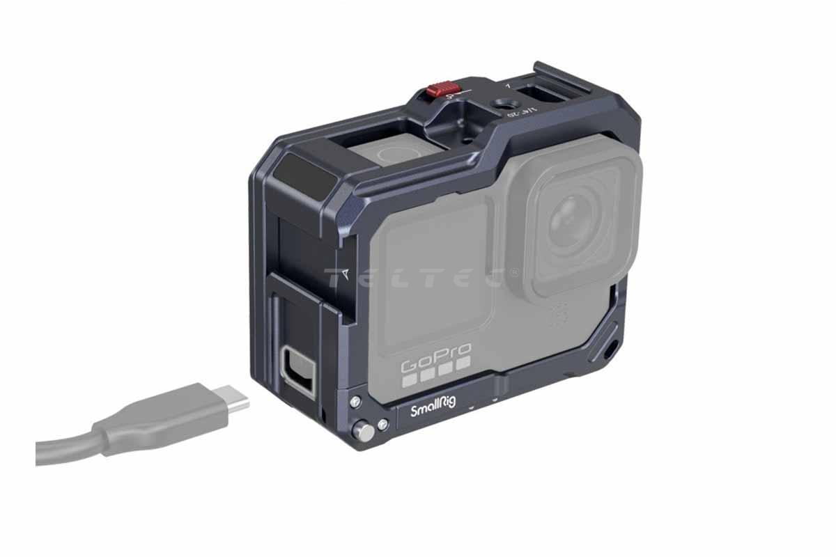 Der SmallRig 3084C Cage für GoPro Hero 12 / 11 / 10 / 9 Black ist ein geschlossener GoPro Hero-Käfig. Er bietet gleichzeitig Schutz für die Kamera und auch Halterungen für Zubehör, ohne dabei wichtige Stellen zu blockieren. So verfügt er etwa über zwei Zubehörschuhe an der oberen und der rechten Seite, die mit einem Mikrofon und einer LED-Videoleuchte kompatibel sind. An der Unterseite dagegen befindet sich eine GoPro-Halterung und eine 1/4"-20-Gewindebohrung, die Original-GoPro- oder auch SmallRig-Zubehör unterstützen. Die Seitenplatte kann schnell und einfach verriegelt und auch wieder abgenommen werden, um so den USB-C-Anschluss freizugeben.