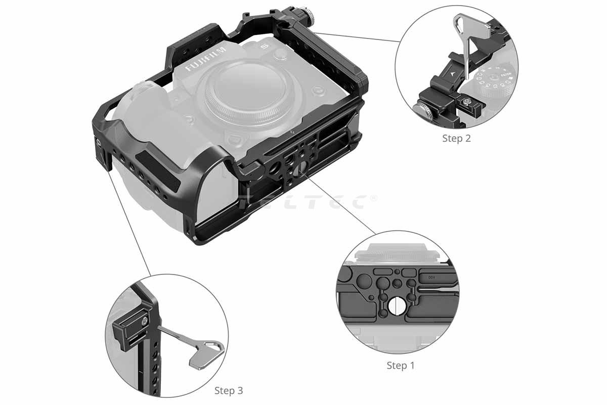 Das SmallRig 3934 Cage für Fujifilm XH2S ist ein formschlüssiger Vollkäfig für die Fujifilm XH2 / XH2S Kamera. Der Käfig ist innen, zum Schutz der Kamera, mit Silikonpolster versehen und bietet zahlreiche Befestigungspunkte für Zubehör. Die Kamera wird mit einer unteren 1/4"-20-Schraube und zwei seitlichen Positionierungsblöcken sicher befestigt, dabei behindert das Cage nicht den Zugriff auf die Anschlüsse, den LCD-Bildschirm oder das Akkufach der Kamera. Außerdem verfügt es über eine Cold-Shoe-Halterung für z.B. Mikrofone oder LED-Leuchten und über eine integrierte NATO-Schiene zum Anbringen von weiterem Zubehör wie z.B. Seitengriffe oder Gelenkarme. Ein integrierter Flachkopfschraubendreher erleichtert die Montage und Demontage der Kamera.