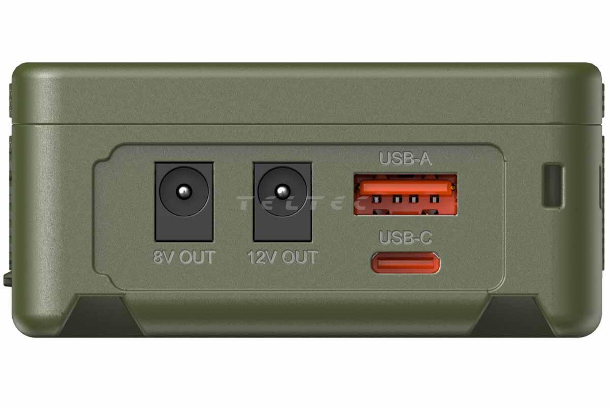 - einen USB-C-Anschluss, einen D-Tap-Anschluss, ein USB-A-Anschluss, DC 8 V-OUT, DC12 V-OUT