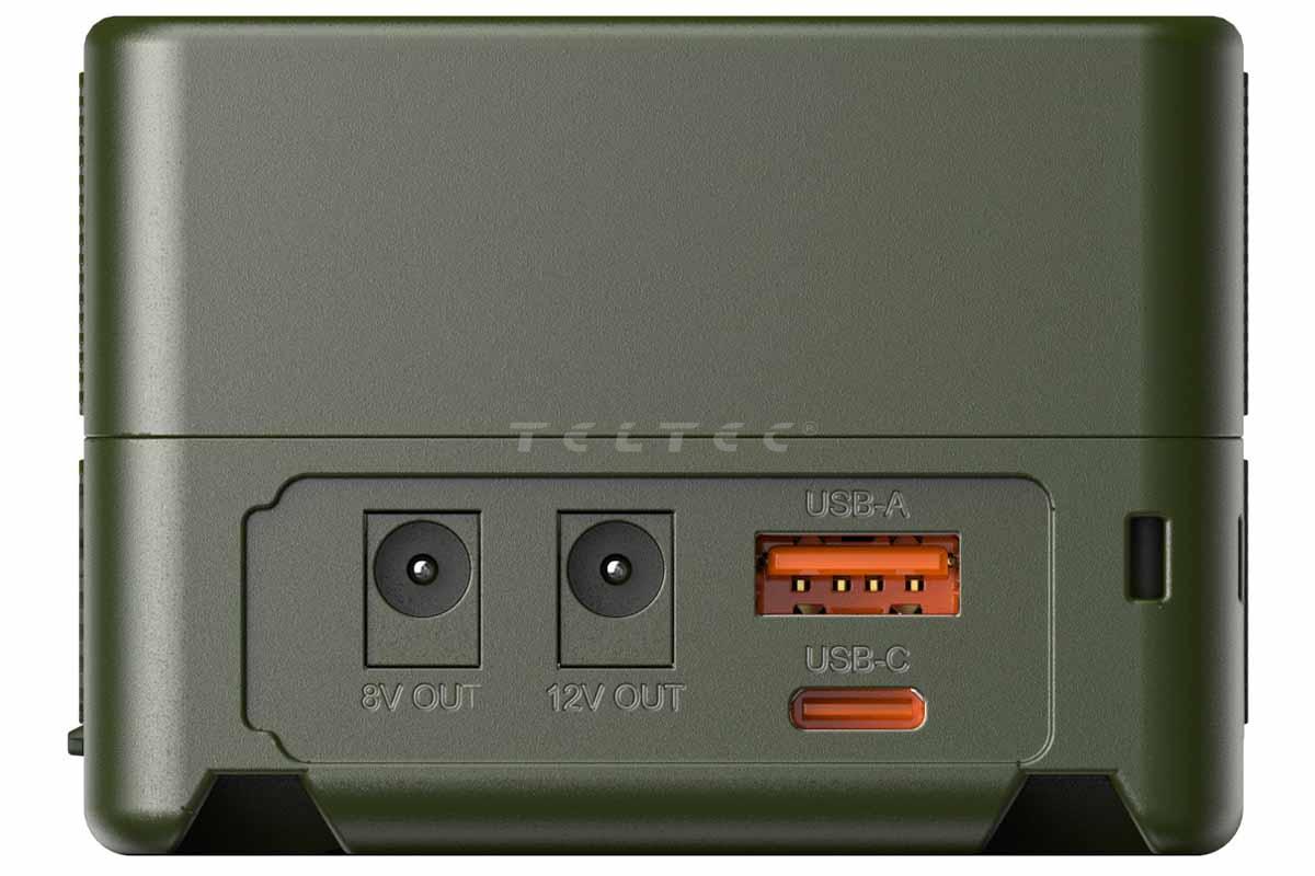 - einen USB-C-Anschluss, einen D-Tap-Anschluss, ein USB-A-Anschluss, DC 8 V-OUT, DC12 V-OUT