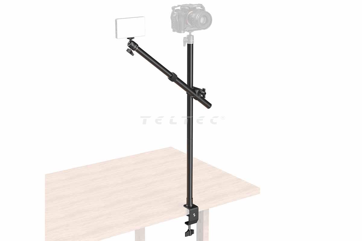 Der SmallRig 4938 Desktop Support Kit ist speziell für die Montage von Kameras, Leuchten, Mikrofonen und weiterem Zubehör ausgelegt und ideal für den Einsatz bei Indoor-Livestreams, Desktop-Fotografie, Videokonferenzen und weiteren Tischaufnahmen. Die modularen Metallknöpfe am Stativ ermöglichen eine schnelle Höhen- und Winkeleinstellung. Dank des Zahnraddesigns ist der Stand besonders stabil und trägt bis zu 2 kg. Der Auslegerarm lässt sich von 30 bis 50 cm ausziehen und bietet eine flexible, stufenlose 360°-Winkelverstellung für vielseitige Aufnahmebedürfnisse. Das durchdachte modulare Design ermöglicht eine einfache Montage und Demontage, indem die Verlängerungsstange und der Auslegerarm schnell abgenommen werden können. Für zusätzliche Flexibilität ist die Oberseite des Hauptarms mit einer 1/4"-20-Gewindebohrung ausgestattet, während der Auslegerarm über einen abnehmbaren 360°-Kugelkopf verfügt. Dadurch können zwei Geräte gleichzeitig befestigt werden.