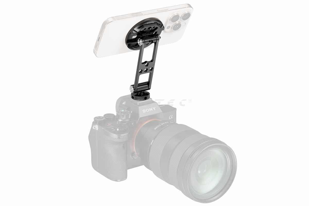 Der SmallRig 5156 Support with Cold Shoe Mount (for Phones) ist eine Smartphone-Halterung mit Kaltschuh. Die Halterung ist mit MagSafe sowie Magnetringen kompatibel und kann über die 1/4"-Gewindelöcher auch etwa Powerbank-Halterungen aufnehmen. Sie verfügt über zwei Scharniere, sodass schnell verschiedene Winkel eingestellt werden können. Zudem befindet sich am unteren Ende ein Kaltschuheinschub, der wiederum an der Unterseite ein 1/4"-Gewindeloch aufweist, wodurch sich mehrere Montagemöglichkeiten mit z.B. Stativen, Selfie-Stick oder Käfigen bieten. Die runde Platte lässt sich abnehmen und als multifunktionale Montageplatte für Zubehör wie Mikrofone usw. verwenden.