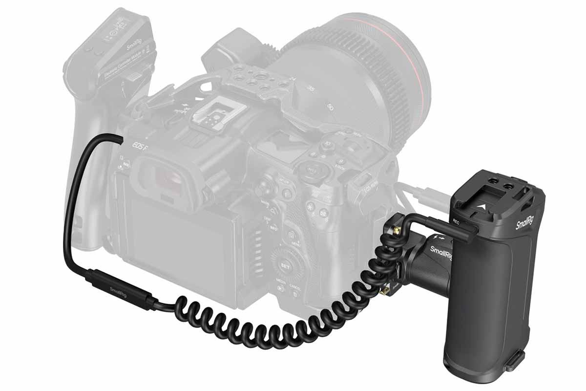 Der SmallRig 5235 Rotating Side Handle with Trigger REC für Canon / Blackmagic Design Cameras ist ein drehbarer Seitengriff mit Auslöser für ausgewählte Canon und BMD Kameras. Dank der Silikonbeschichtung lieg der Griff sicher in der Hand. Er lässt sich in beide Richtungen um volle 360° drehen, um ein bestmögliches Handling zu erlauben. Wird der Griff mit dem beiliegenden Steuerungskabel an die Kamera angeschlossen, lässt diese sich mit dem Knopf am Griff auslösen. Er ist kompatibel mit einem separat erhältlichen NP-F550 / 570 Akku, welcher auch unterseitig befestigt werden kann, um über den USB-C-Port des Griffs weitere Geräte aufzuladen. Dabei unterstützt viele Schnellladeprotokolle wie PD, QC, AFC und FCP. Außerdem bietet der Griff 1/4"-20-Gewinde, einen Kaltschuh und eine Halterung für Handgelenksschlaufen.