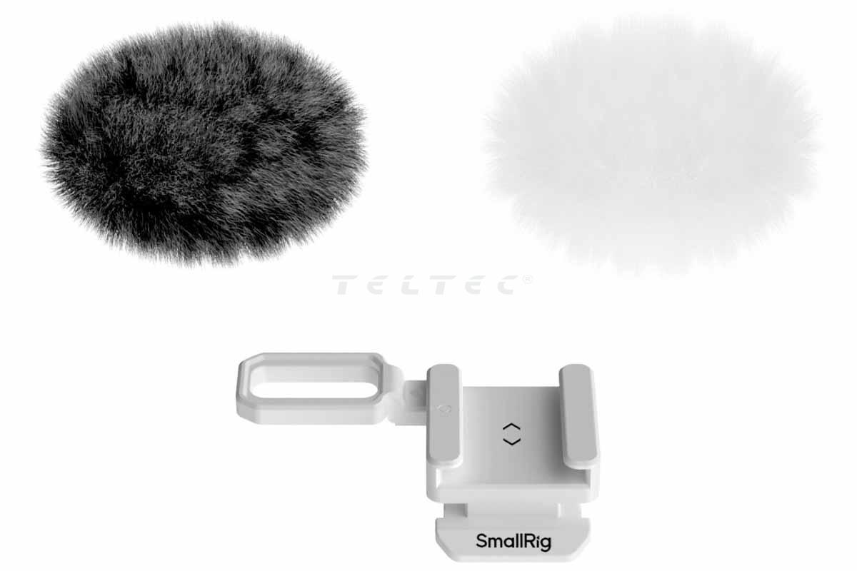Das SmallRig 5434 Furry Windscreen Kit für Canon EOS R50 V (2 Stück) umfasst einen grauen und einen weißen Fellwindschutz, die zur Unterdrückung von Windgeräuschen dienen. Die Befestigung an der Kamera erfolgt per Blitzschuhadapter, bei dem ein integrierter Silikonpolster Kratzer verhindert.