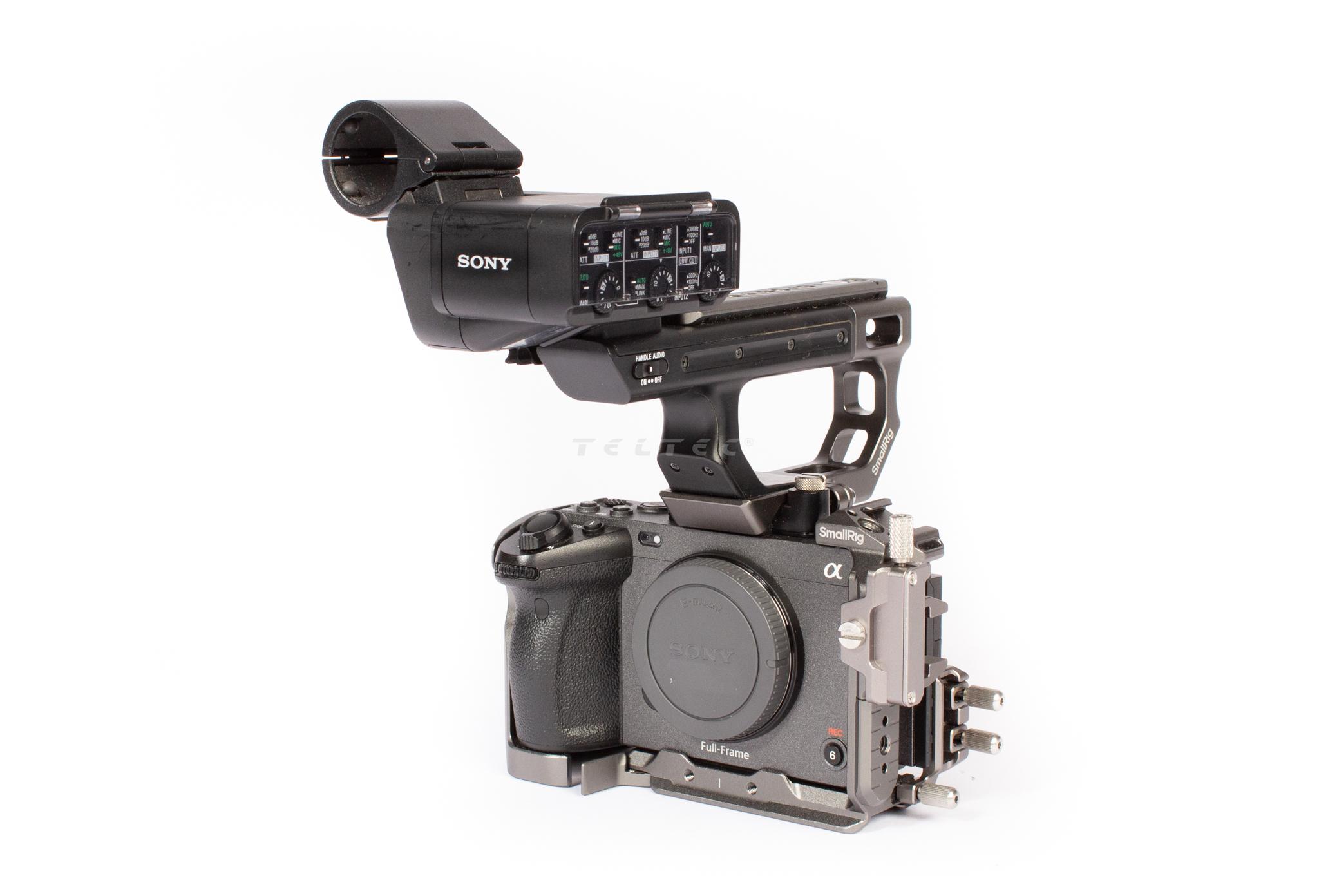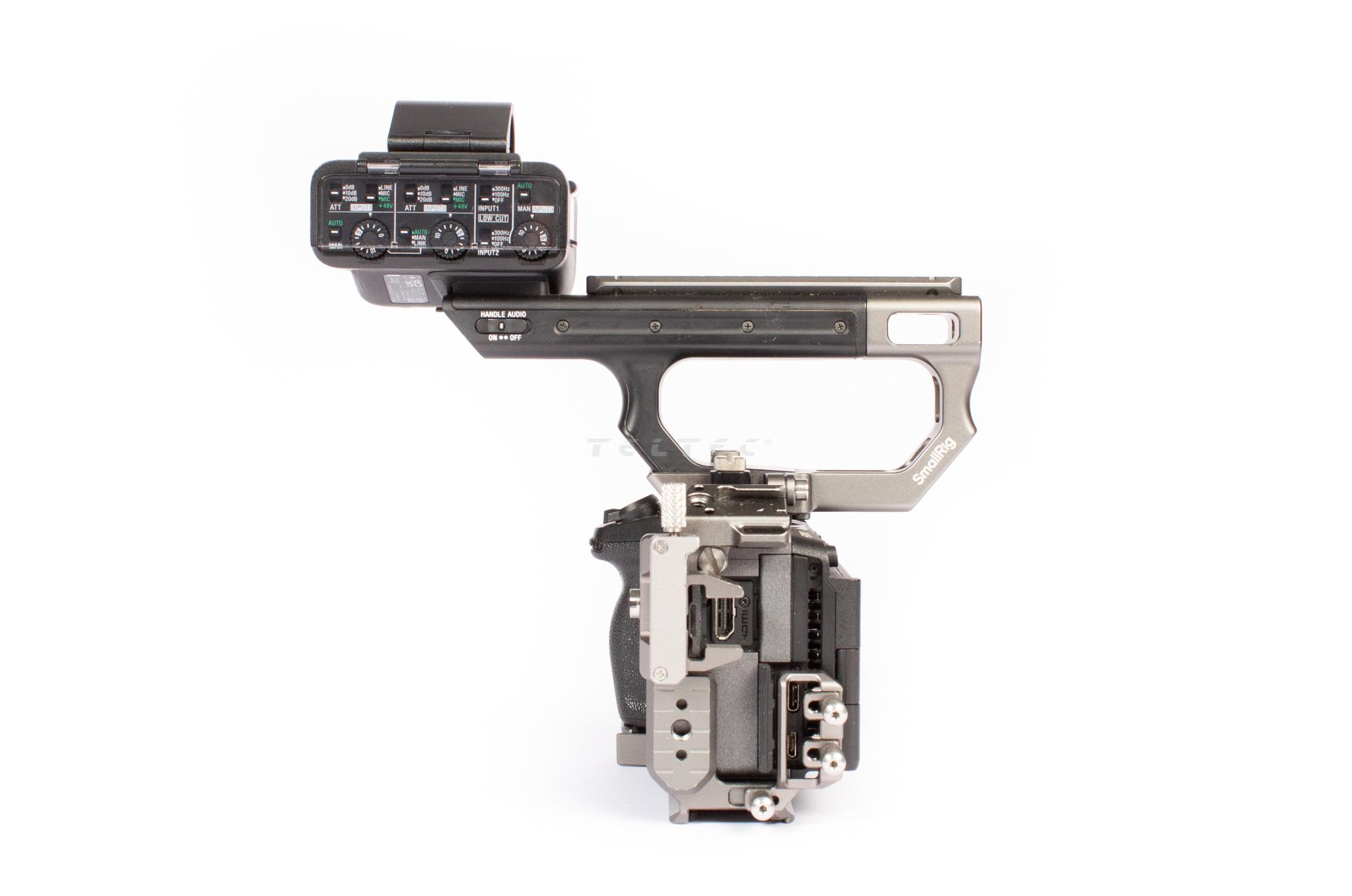 An den Multi Interface (MI)-Schuh der Kamera lässt sich ein Griff mit XLR-Adapter mit zwei Full Size-XLR-Anschlüssen anbringen, um bequeme, stabile Aufnahmen in schwierigen Situationen (z. B. aus der Froschperspektive) zu ermöglichen.