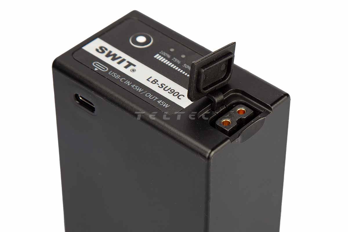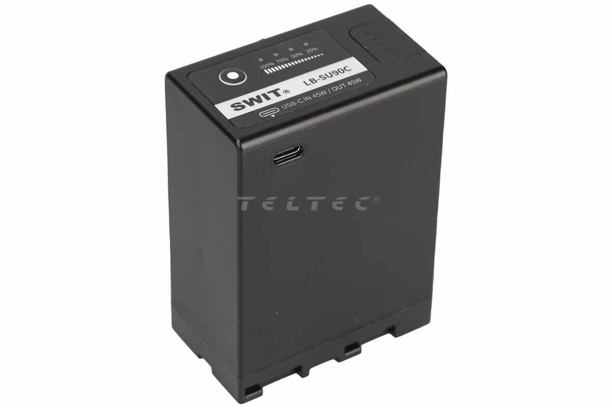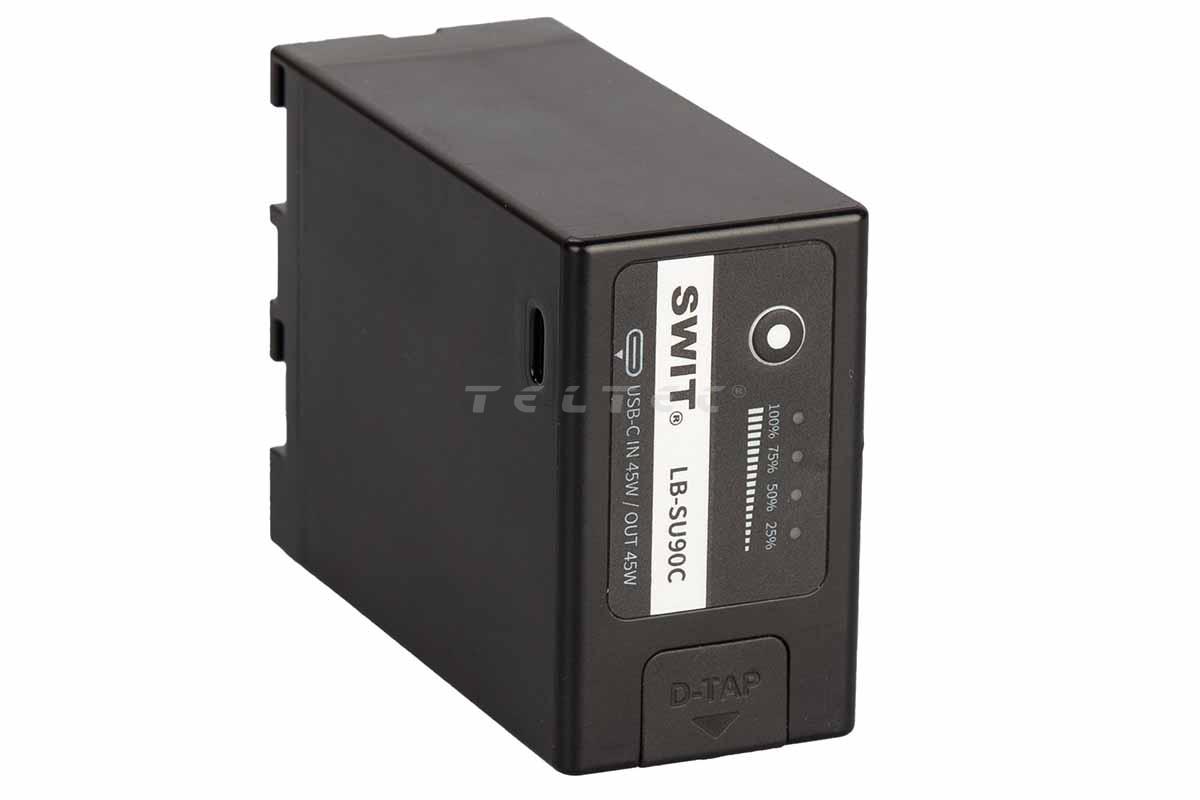 Das Swit LB-SU90C ist ein 90 Wh großer BP-U DV-Akku mit D-Tap Ausgang und 45 W USB-C Ein-/Ausgang für SONY PXW FS5/FS7, PXW-FX6/FX9, PXW-Z280/X280, u. a. Kameras. LB-SU90C verfügt über einen D-Tap-Anschluss mit 11-16,8 V und 70 W / 6 A, über den sich der Akku mit einem Swit PC-U130B2 aufladen lässt. Über den USB-C-Anschluss können verschiedene Laptops, Tablets oder Smartphones angeschlossen werden. Zudem lässt sich der Akku an ein USB-C-Ladegerät anschließen und innerhalb von 3 Stunden vollständig aufladen. Außerdem stehen mehrere Swit Ladegeräte wie beispielsweise dem LC-D421, zur Verfügung, der bis zu vier Akkus gleichzeitig und innerhalb von 3,5 Stunden vollständig auflädt. Über vier LEDs wird die verbleibende Leistung angezeigt.