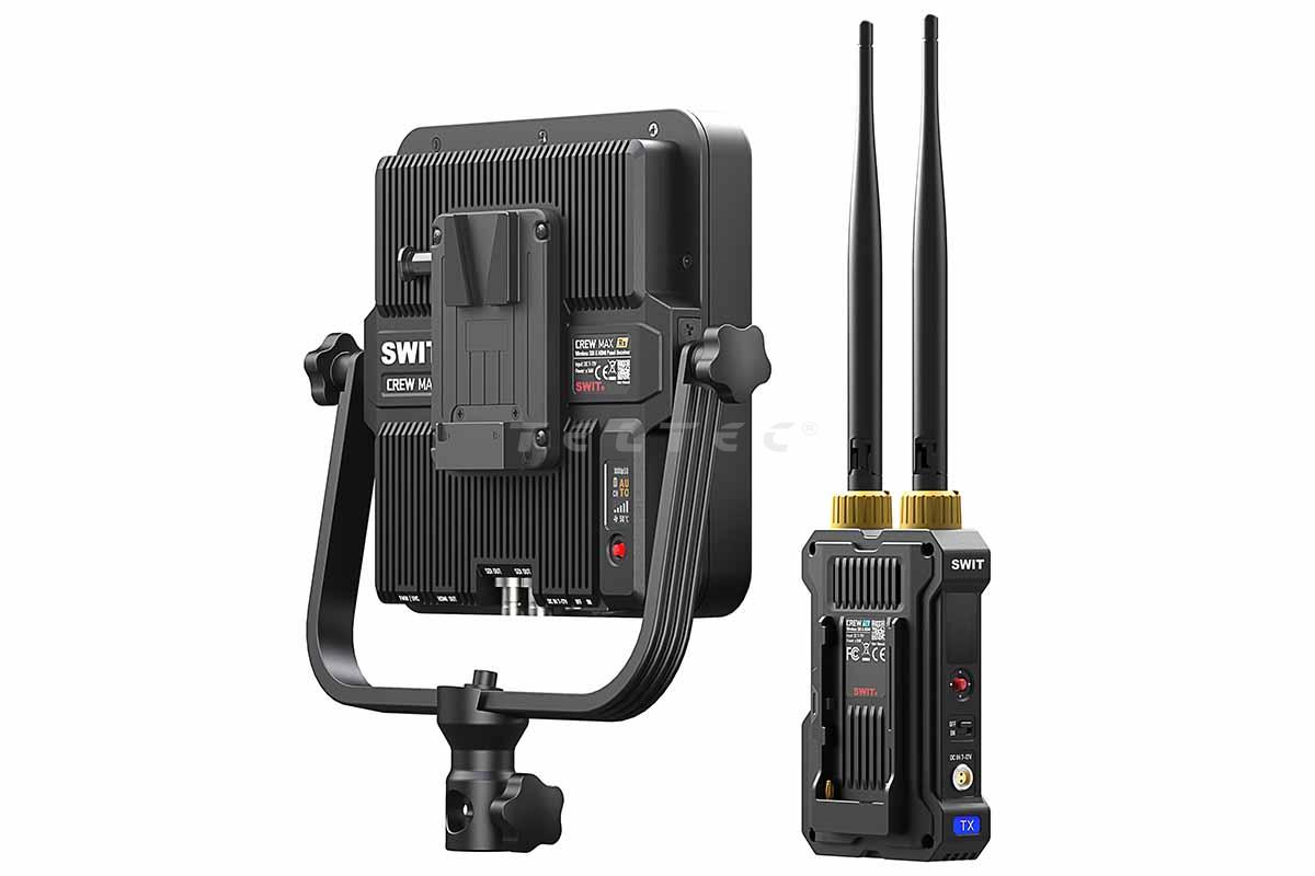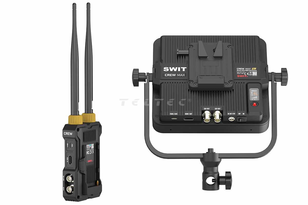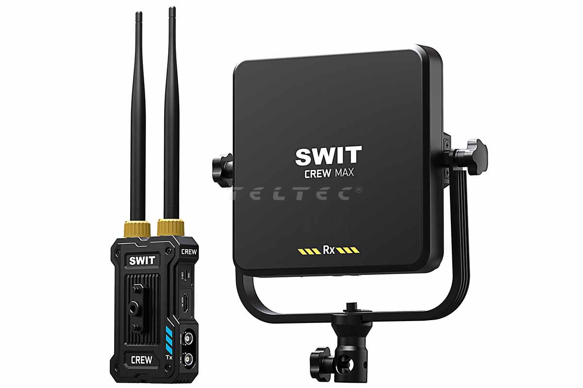 Das Swit CREW MAX ist ein professionelles drahtloses Videosystem mit bis zu 3 km Reichweite, speziell entwickelt für Broadcast-, Film- und Eventproduktionen. Das Set besteht aus einem kompakten Transmitter mit HDMI- und SDI-Eingängen und einem Panel-Receiver mit integrierter Hochleistungsantenne, der für große Reichweiten und stabile Verbindung sorgt. Dank KUWI 2.0 RF-Technologie und H.265-Codec mit bis zu 26,8 Mbit/s liefert das System eine visuell verlustfreie Bildübertragung bei konstanter Latenz von 32 ms. Zusätzlich ist eine USB-C-Capture-Funktion für Livestreaming integriert. Das System unterstützt Multicast mit bis zu 4 Empfängern und überträgt Metadaten sowie Timecode-Trigger zuverlässig. Der Empfänger kann direkt per V-Mount-Akku betrieben werden – ideal für mobile Setups.