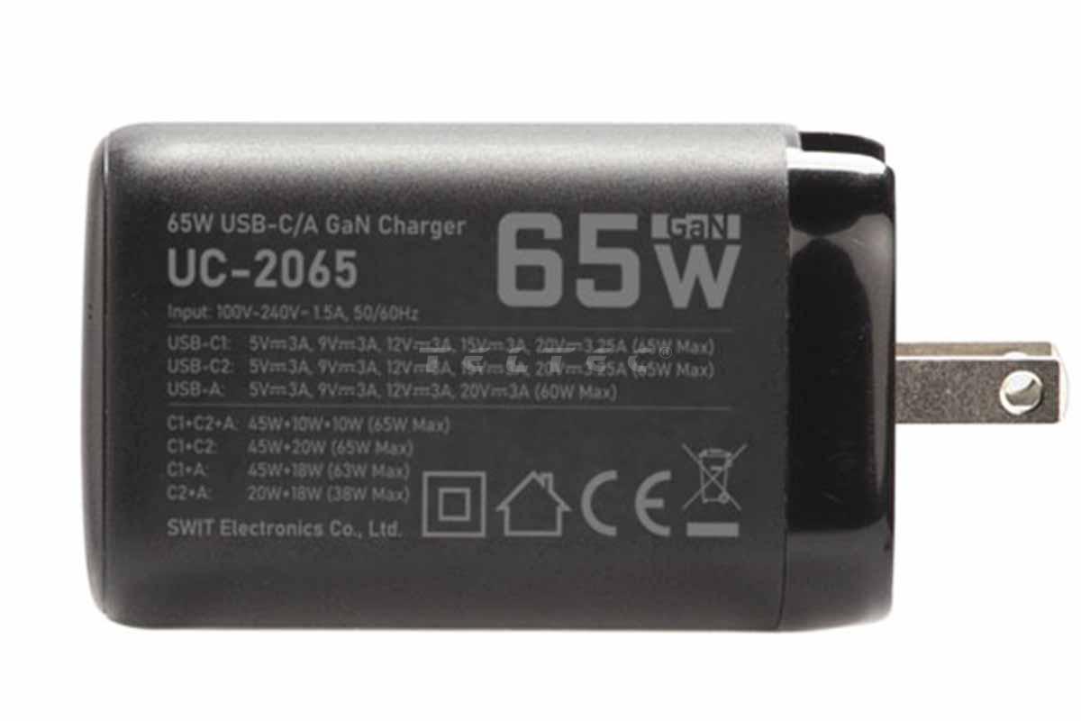 Das Swit UC-2065 ist ein kompaktes USB-C / USB Typ A Schnellladegerät mit GaN (Galliumnitrid) Technologie. Das UC-2065 Ladegerät bietet zwei USB-C sowie einen USB Typ A Anschluss die simultan genutzt werden können, wobei die Ausgangsleistung jedes Anschlusses begrenzt ist , wenn mehrere Anschlüsse zusammen verwendet werden, maximal 65W.