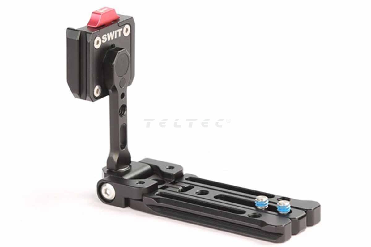 Das Swit TA-T10S ist eine Montageplatte mit V-Mount-Anschluss, die zusätzlich zu einem Tischstativ umgerüstet werden kann. Der TA-T10S hat eine Traglast von max. 2 kg und ist aus leichtem Aluminium gefertigt. Zudem ist der Kopf um 210° neig- und um 360° drehbar. Darüber hinaus verfügt die Montageplatte über den Arca Swiss Standard, sodass sie leicht an kompatiblen Arca Swiss Stativköpfen angebracht werden kann. Bei der Verwendung als Tischstativ werden die Stativbeine aus der Grundplatte ausgeklappt. Über die Schnellwechselplatte, die an vielen Videogeräten mittels 1/4"-Schraube befestigt wird, erfolgt anschließend die Montage auf dem Stativ.