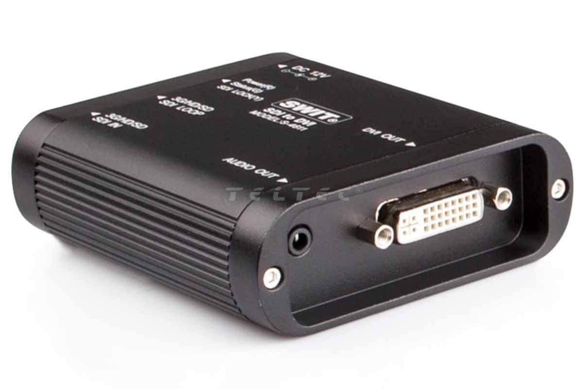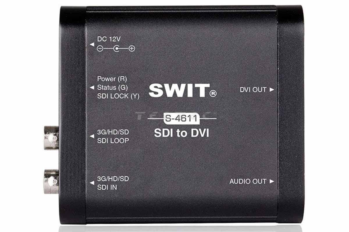 Der Swit S-4611 ist ein Mini-Konverter für die Umwandlung von SDI in DVI (DVI-D, 18+1-Anschluss), der für die Anzeige von SDI-Video mit bis zu 3 Gb/s auf DVI-Monitoren, Fernsehern, LED-Boards oder Projektoren verwendet werden kann. Die eingebetteten SDI-Audiokanäle 1 und 2 können in analoge Audiosignale umgewandelt und über eine 3,5-mm-Kopfhörerbuchse ausgegeben werden; sie unterstützen eine Abtastrate von 48 kHz.