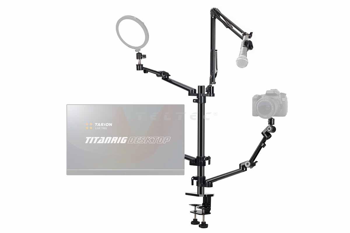 Das Tarion TitanRig Desktop Set ist eine Stangenkombination mit Tischklemme, je einem X-, Y- und Z-Arm sowie einem Mikrofonarm. Durch seine komplexe Ausstattung eignet sich das Desktop Set gut für Leute, die größere Setups nutzen. Dank seiner Beschaffenheit aus stabilem Aluminium kann jeder Arm mit bis zu 7 kg belastet werden. Die beiliegenden X-/Y-/Z-Arme sind mit ihren jeweiligen Aufnahmen für verschiedene Zwecke wie Laptop-/Tablet-, Ringlicht- und Kamera-Halterung, während der vierte, klappbare Arm für Mikrofone gedacht ist. Dank der beiden Gelenke in den XYZ-Armen, die jeweils um 180° neig- und 360° schwenkbar sind, lassen sich viele Winkel einstellen, die nahezu jeden Bedarf abdecken.