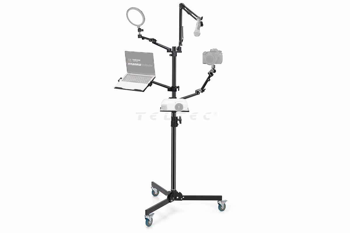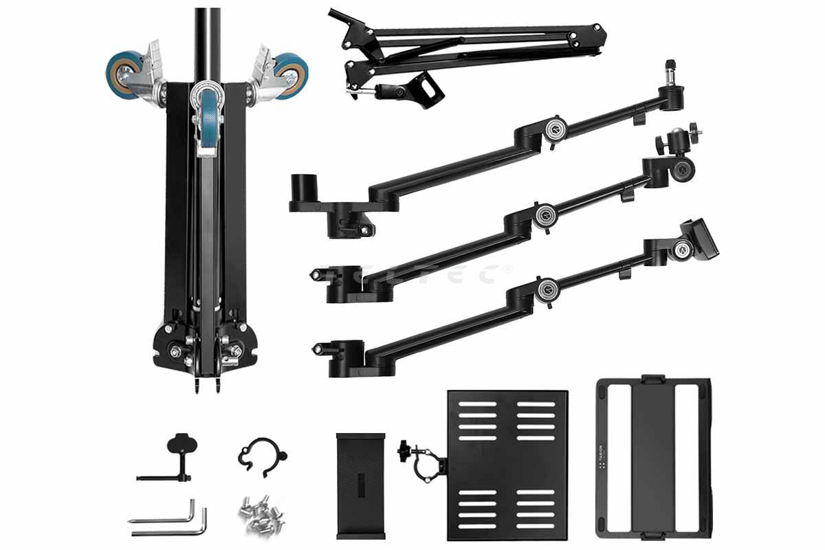 Das Tarion TitanRig Studio Set ist eine Stangenkombination mit Dolly und Ablage, je einem X-, Y- und Z-Arm sowie einem Mikrofonarm. Durch seine komplexe Ausstattung inkl. Dolly eignet sich das Studio Set gut für Leute, die größere Setups nutzen und mobil sein müssen. Dank seiner Beschaffenheit aus stabilem Aluminium kann jeder Arm mit bis zu 7 kg belastet werden. Die beiliegenden X-/Y-/Z-Arme sind mit ihren jeweiligen Aufnahmen für verschiedene Zwecke wie Laptop-/Tablet-, Ringlicht- und Kamera-Halterung, während der vierte, klappbare Arm für Mikrofone gedacht ist. Dank der beiden Gelenke in den XYZ-Armen, die jeweils um 180° neig- und 360° schwenkbar sind, lassen sich viele Winkel einstellen, die nahezu jeden Bedarf abdecken.