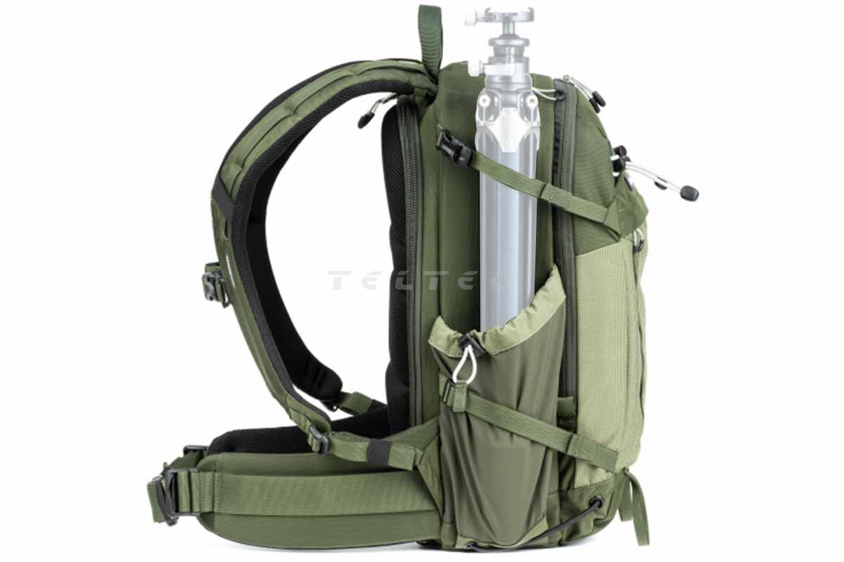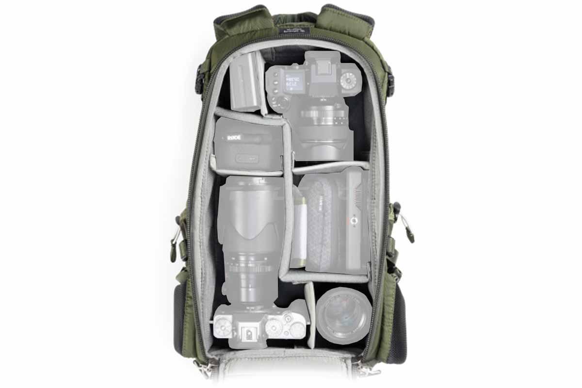 Der thinkTank BackLight 18L Montane Green mit einem rückseitigen Fach für Fotoausrüstung ermöglicht es, auf Ausrüstung zuzugreifen, ohne den Rucksack abzunehmen. Man kann Objektive wechseln oder schnell ein Foto machen, indem man den Rucksack nach vorne dreht, während der Hüftgurt noch befestigt ist. Der Zugriff auf das Rückenteil bietet außerdem mehr Sicherheit beim Reisen, da die Kameraausrüstung hinter dem Rücken geschützt ist.