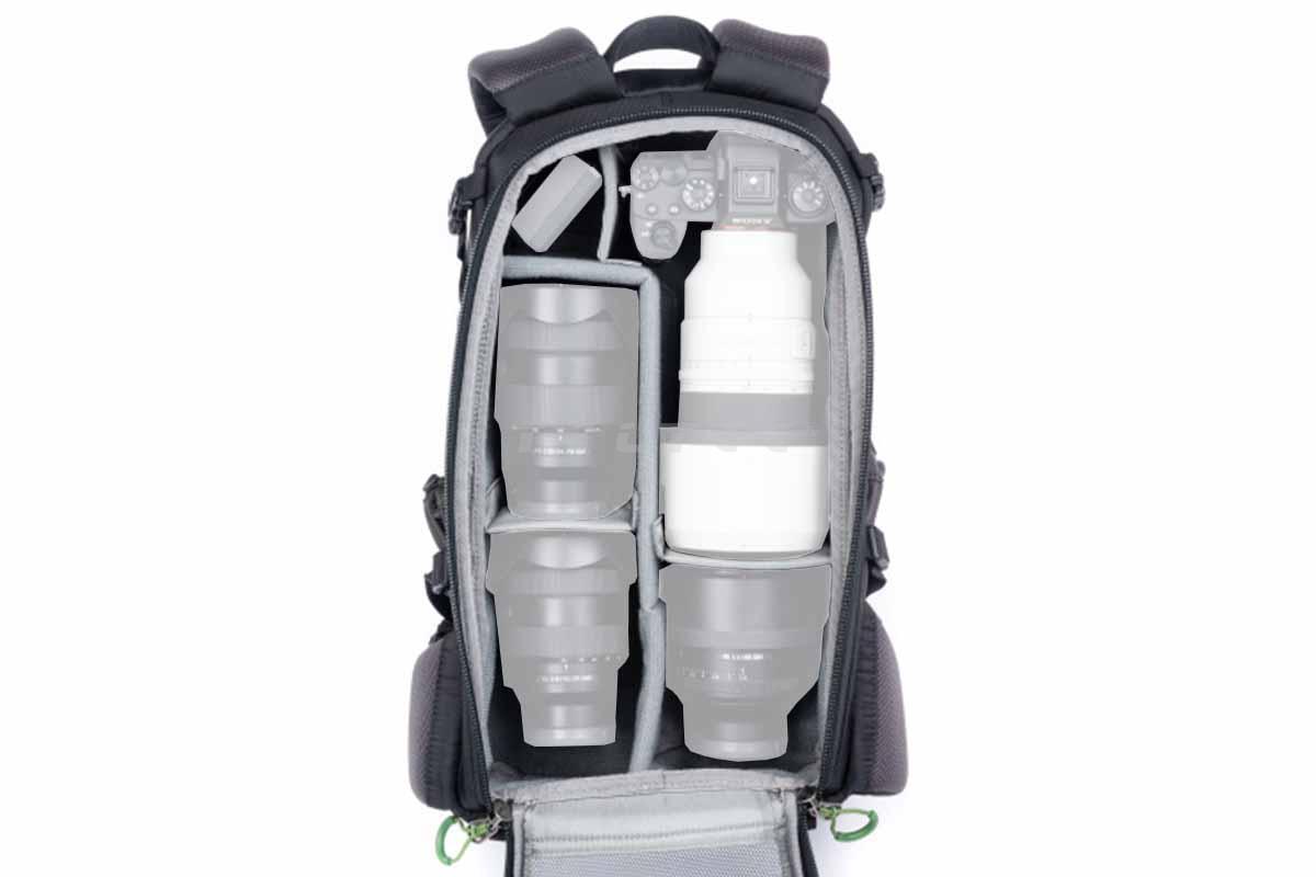- Verstellbare Trennwände für große Teleobjektive, traditionelle Fotoausrüstung oder persönliche Gegenstände
