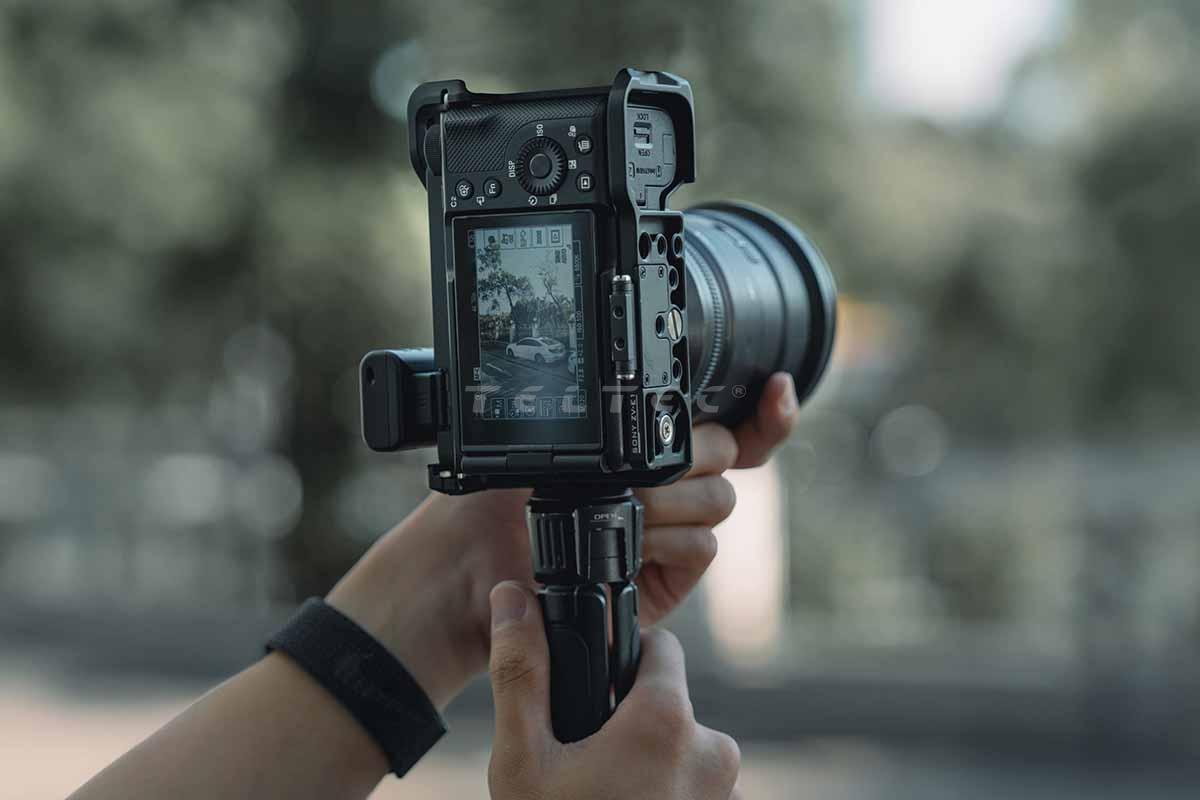 Der Tilta TA-T35-A-B ist ein Halbkäfig für die Sony ZV-E1 Kamera. Dieser Kamerakäfig bietet zusätzlichen Schutz für das Kameragehäuse und ermöglicht die Befestigung einer Vielzahl externer Zubehörteile. Er verfügt über mehrere Befestigungsoptionen wie einen Cold Shoe Receiver, eine NATO-Schiene, M3-Gewinde für Objektivträger und 1/4"-20-Gewinde mit Fixierpunkten. Mit der mitgelieferten NATO-Schiene und dem NATO-Top-Handle sind flexiblere Aufnahmen und eine komfortablere Handhabung möglich, insbesondere bei niedrigen Winkeln. Der obere Handgriff erweitert die Befestigungsmöglichkeiten mit zusätzlichen 1/4″-20-Gewinden und einem Cold Shoe Mount, der sich gut für die Montage eines externen Monitors eignet. Die abnehmbare ARCA-Schnellwechselplatte ermöglicht nahtlose Übergänge zwischen horizontalen und vertikalen Aufnahmekonfigurationen und kann sowohl am Boden als auch an der Seite des Käfigs montiert werden. Durch die zahlreichen Kontaktpunkte zwischen Kameragehäuse und Käfig wird eine sichere und stabile Verbindung hergestellt, die die Kameradrehung einschränkt, insbesondere bei Verwendung eines drahtlosen Follow-Focus-Motors. Der Kamerakäfig ist kompatibel mit dem drahtlosen Mikrofon ECM-W2BT von Sony und lässt sich einfach in ein Audio-Setup integrieren. Der Zugnag zu alles wichtige Funktionen und Anschlüssen wird nicht beeinflusst.
